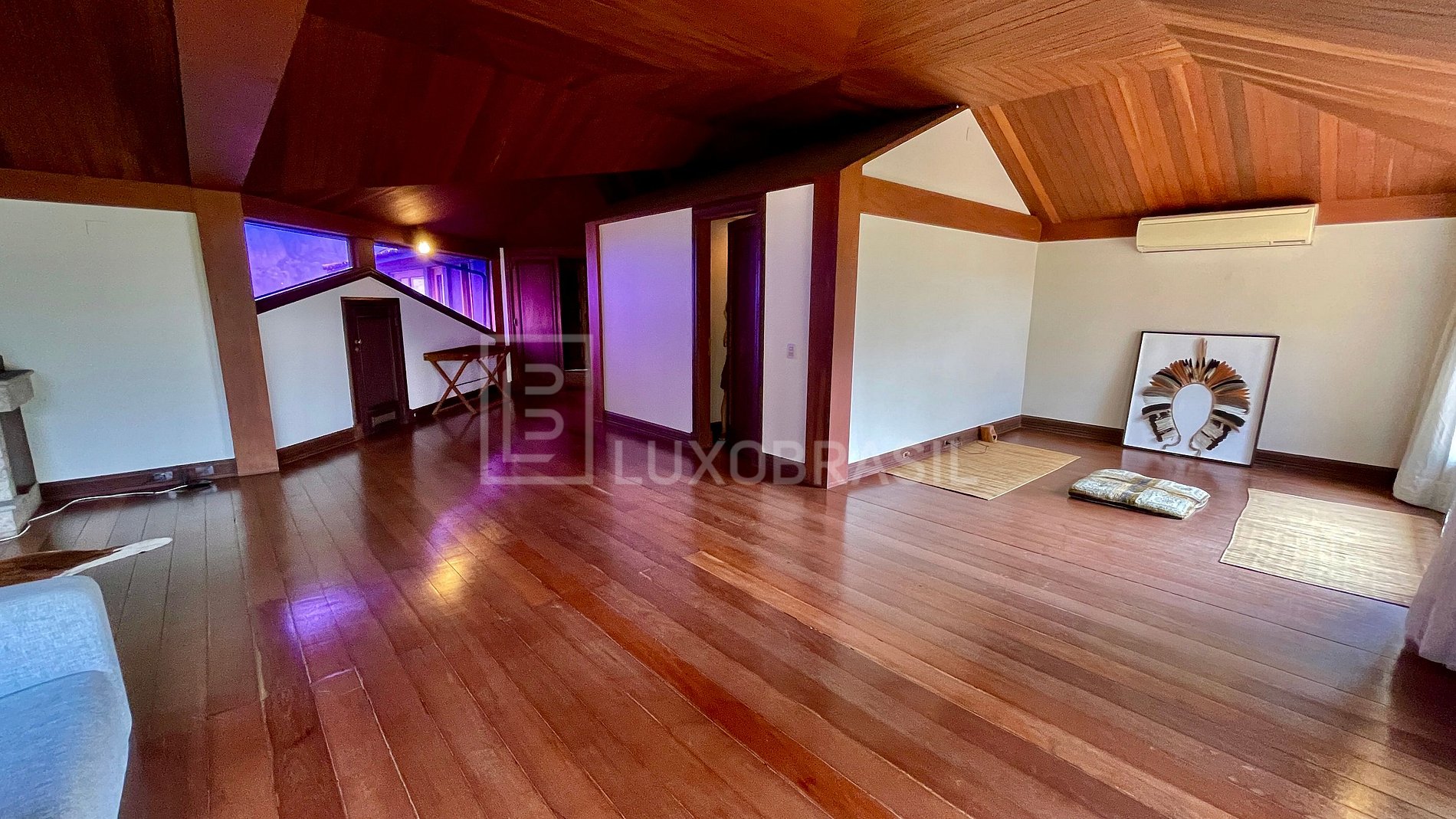 No segundo andar ficam 02 suítes com lareira, sendo a suíte máster com mais de 100 m², banheira de hidromassagem, closet, sauna a vapor e varanda exclusiva com vista.
