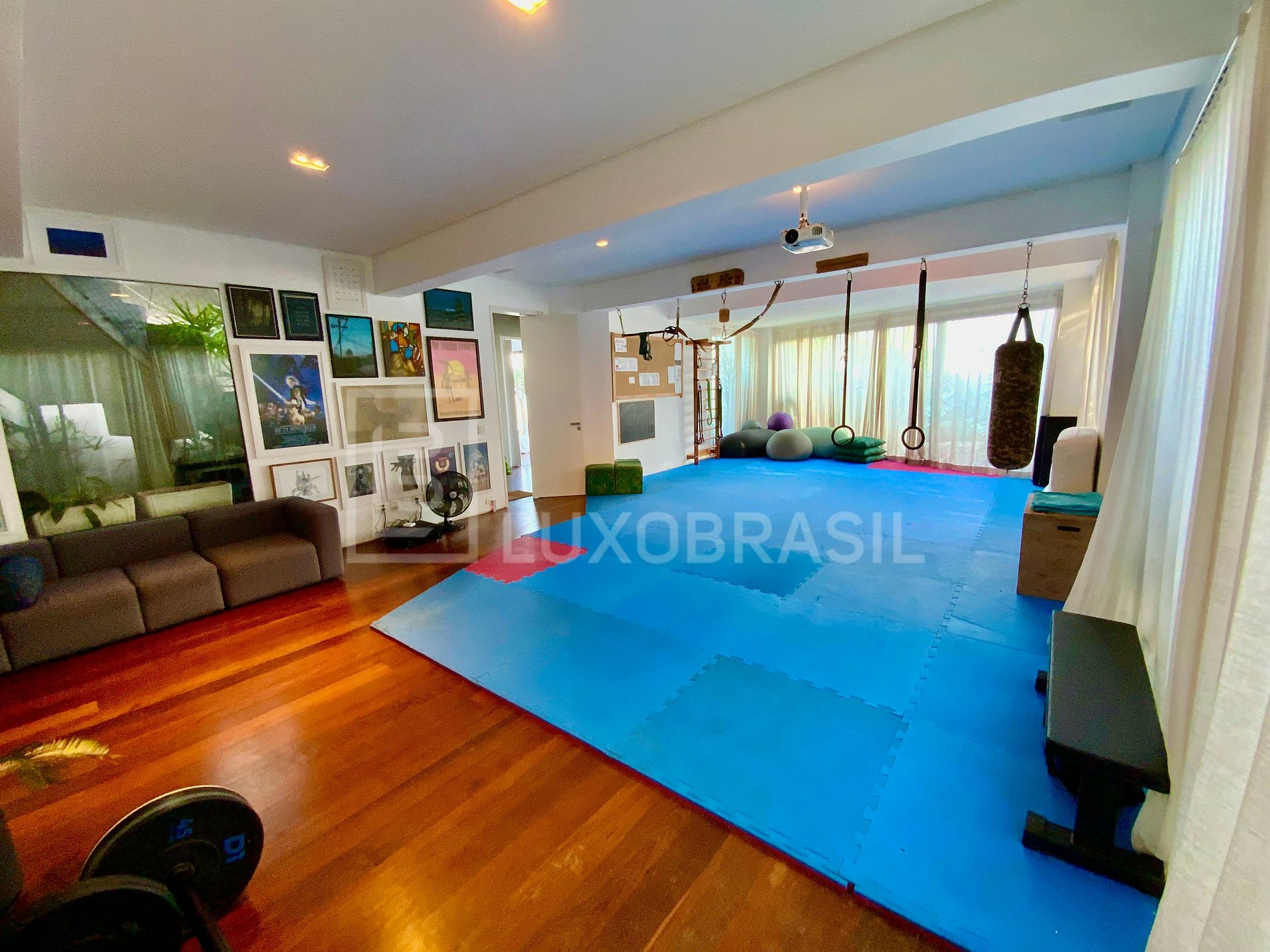 On the lower floor you'll find the entrance hall, a large gym with exercise equipment and the fifth suite overlooking the front garden.