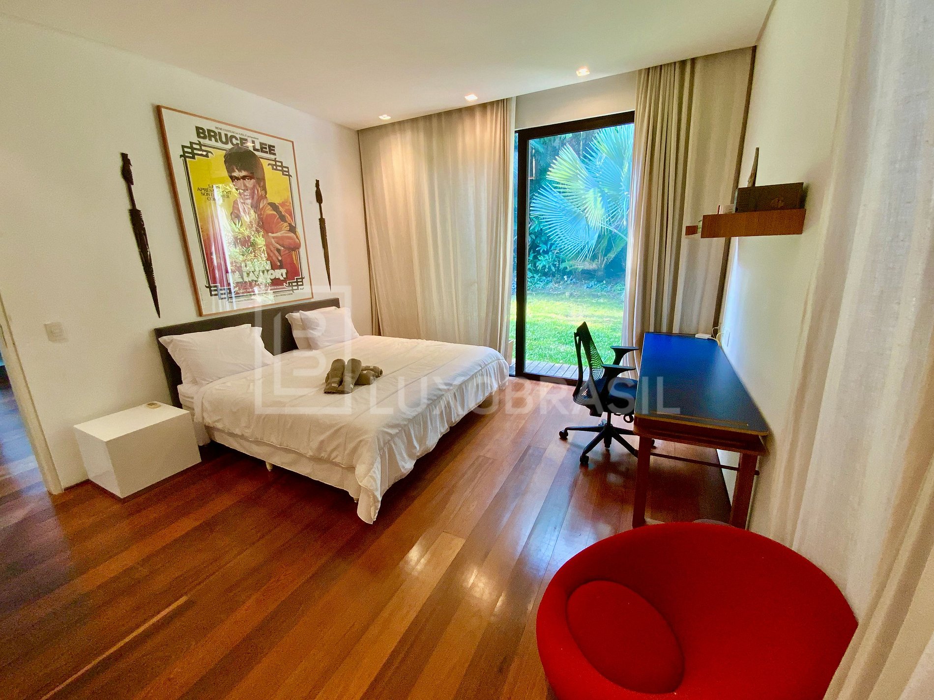 On the upper floor you'll find the house's four main suites, two of which have beautiful sea views and two face the garden. The master suite has a Jacuzzi, an anteroom with a desk and wonderful views of the sea and Joatinga Beach.