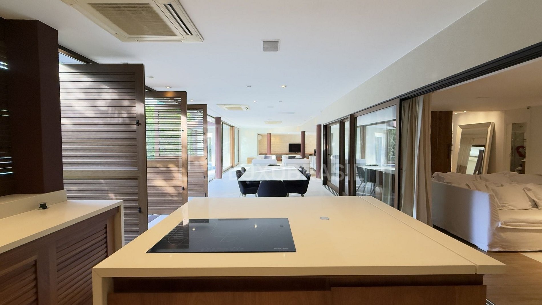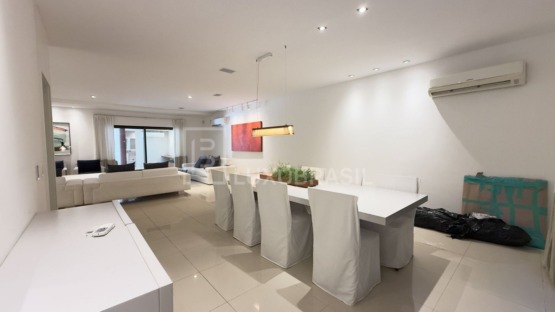 The social area is defined by complete integration between environments. Large sliding glass doors with aluminum frames open generously to the outdoor area, creating visual and functional continuity between the interior and the garden.