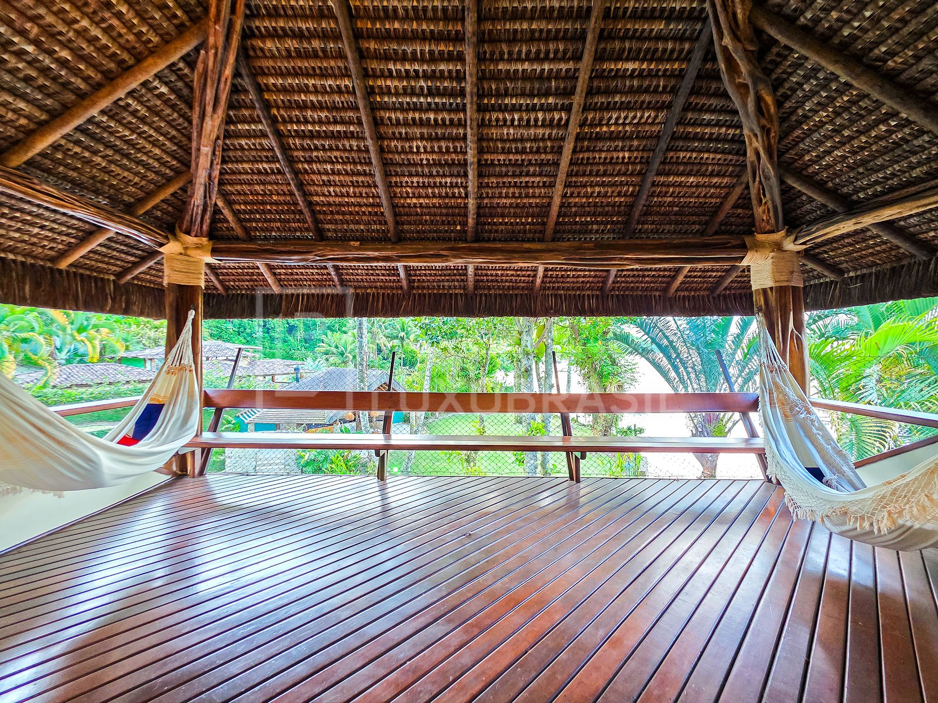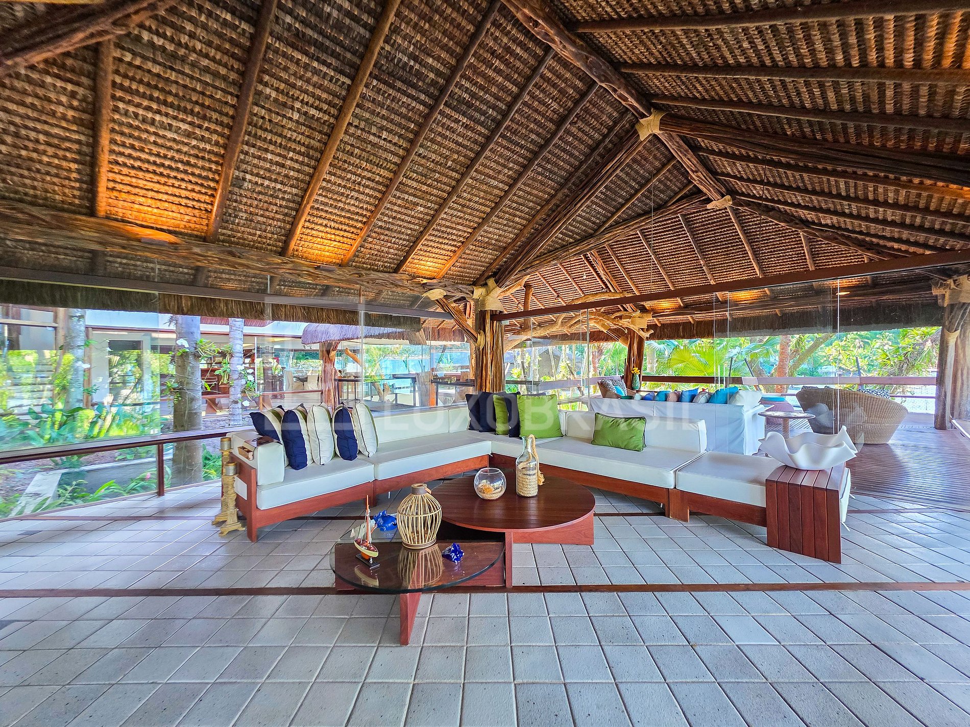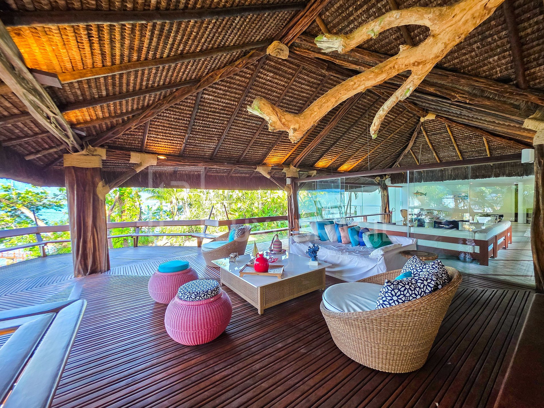 Set on a privileged plot of approximately 1,700 m², the residence features 2 floors and spacious, integrated rooms. The construction combines steel, wood, glass, and a thatched roof, creating a sophisticated, tropical style perfectly harmonized with the surrounding vegetation—ideal for those seeking a unique accommodation experience immersed in nature.