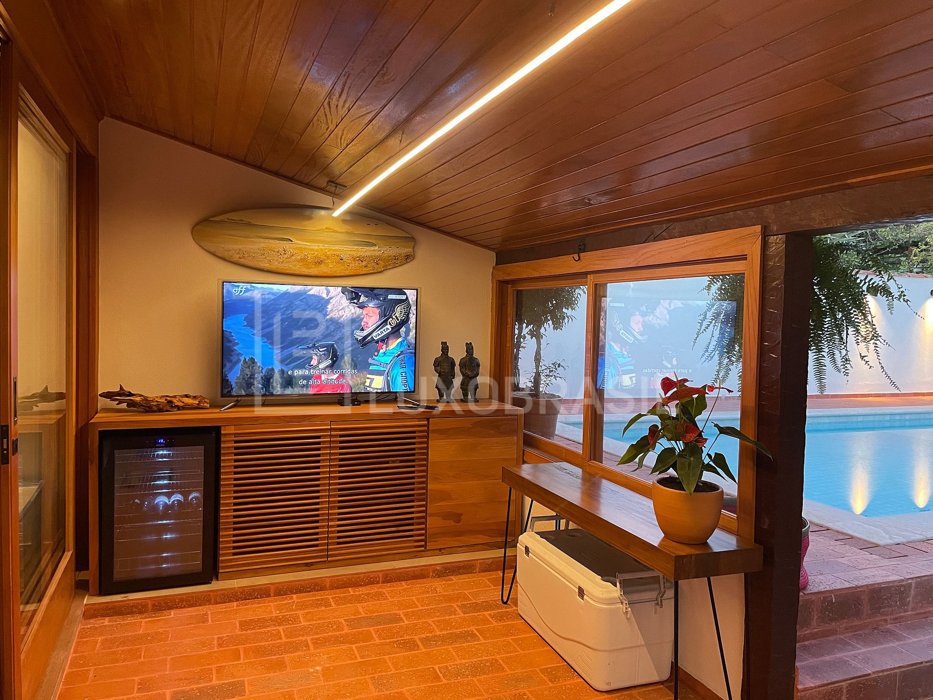 The house consists of an integrated living and dining room, a fully equipped kitchen, a lounge with a sofa, a wooden table and benches and a snooker table, and a TV room with a wine cellar. There are 06 suites, all with air conditioning, blackout, curtains and mattresses from the American brand Simmons, and there is also 01 bedroom with a TV and sofa bed.