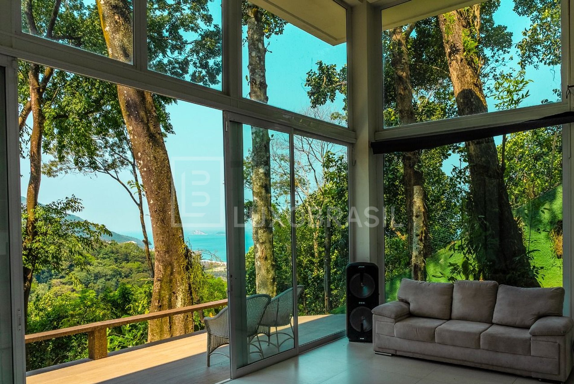 Casa da Lua is located on Estrada das Canoas in São Conrado. It features a beautiful view and is surrounded by lush greenery with century-old trees. The house offers a veranda, living room, and an integrated kitchen with large glass windows that allow natural light to fill the entire space.