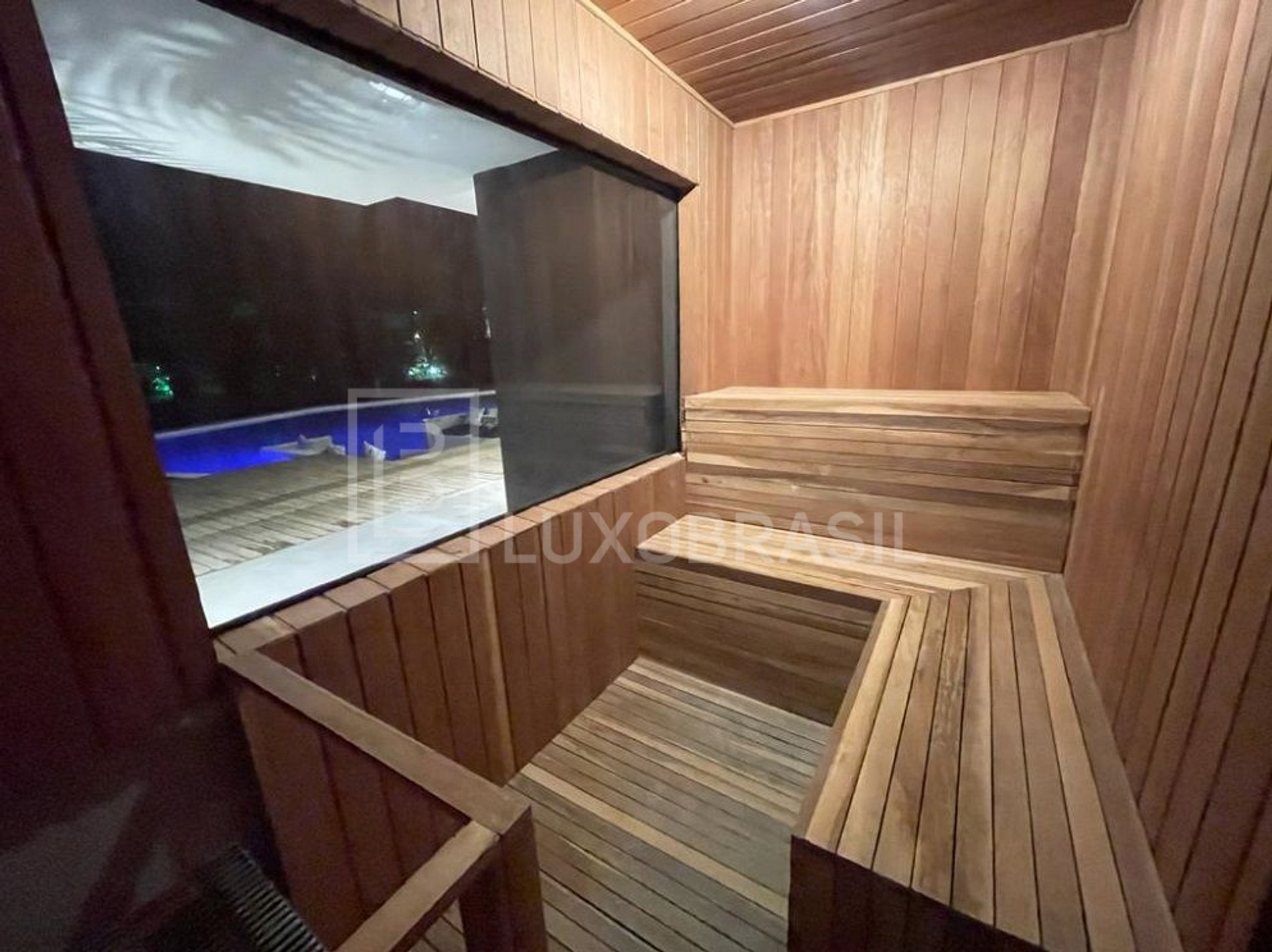 The house has 05 suites, 04 of which face the canal, all with 400-thread-count sheets and air conditioning, a living room, dining room and full kitchen. Its wonderful outdoor area consists of a glassed-in sauna with a canal view, a 90m² resort pool, a whirlpool, a gourmet area with barbecue, a small beach, a private deck for mooring large boats (up to 90 feet) and an ire pit with a glass visor, a beautiful view of the whole house.