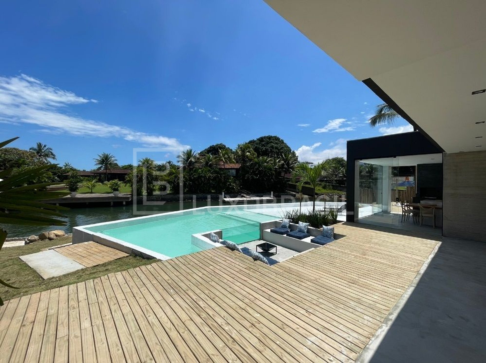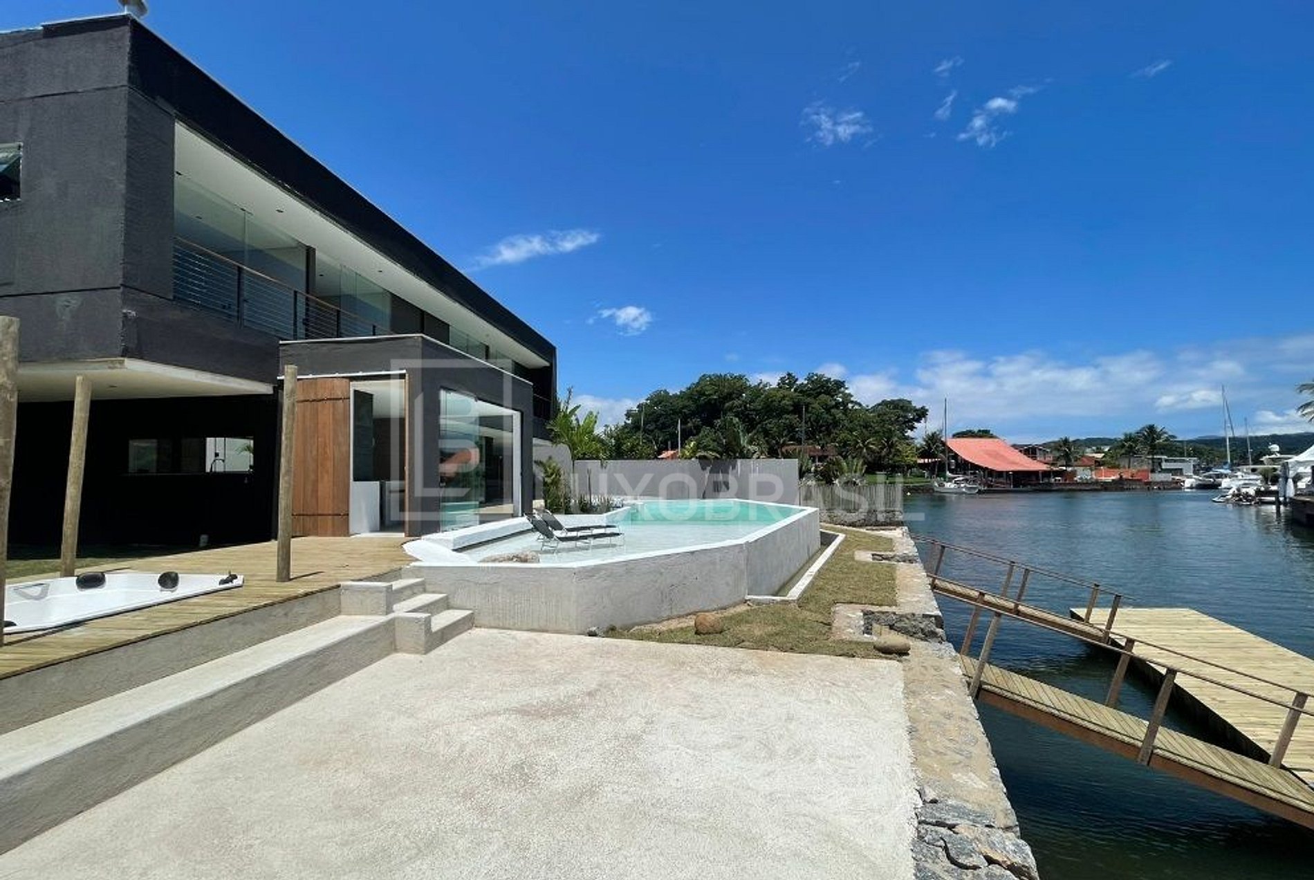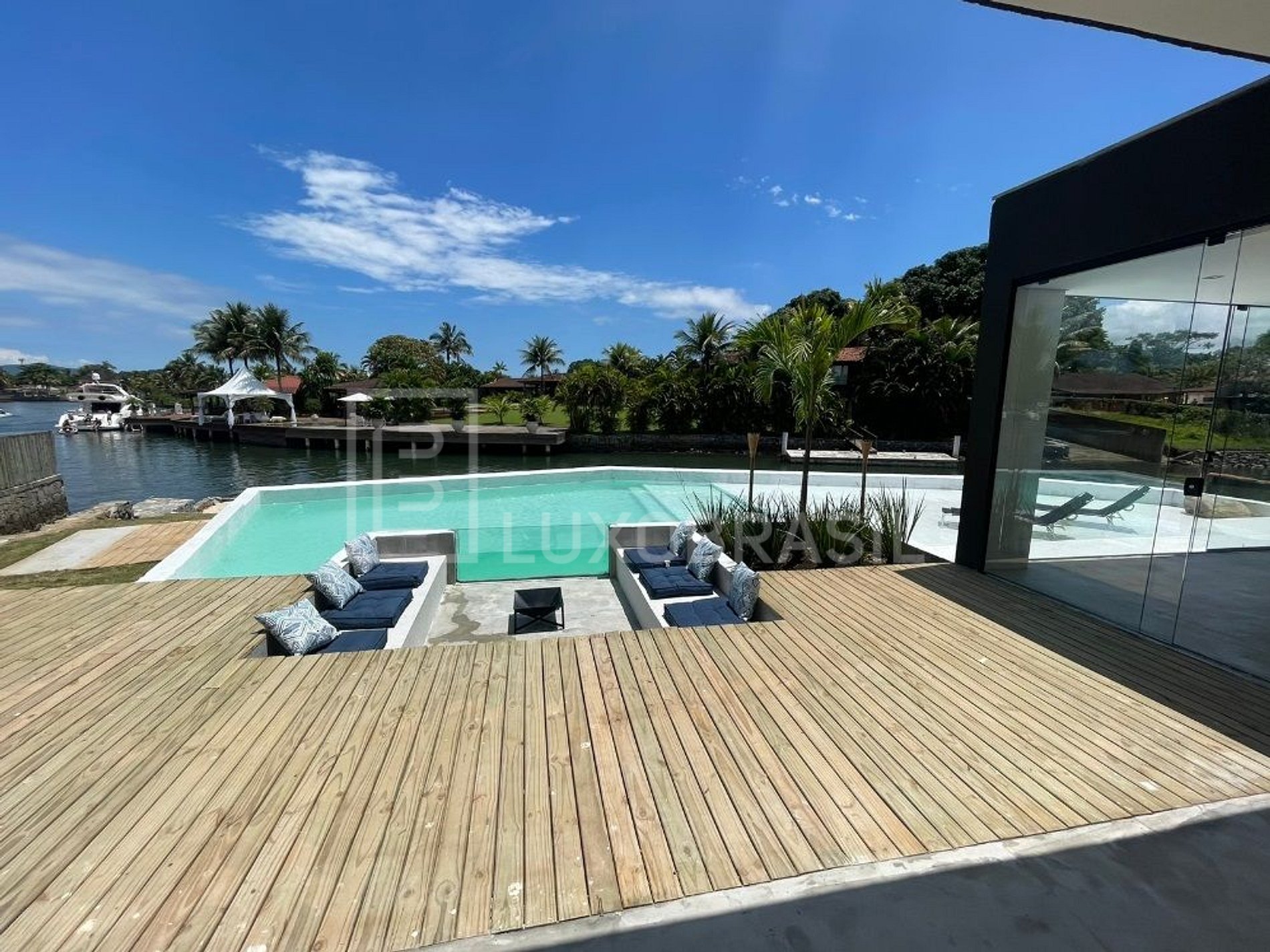 The house has 05 suites, 04 of which face the canal, all with 400-thread-count sheets and air conditioning, a living room, dining room and full kitchen. Its wonderful outdoor area consists of a glassed-in sauna with a canal view, a 90m² resort pool, a whirlpool, a gourmet area with barbecue, a small beach, a private deck for mooring large boats (up to 90 feet) and an ire pit with a glass visor, a beautiful view of the whole house.