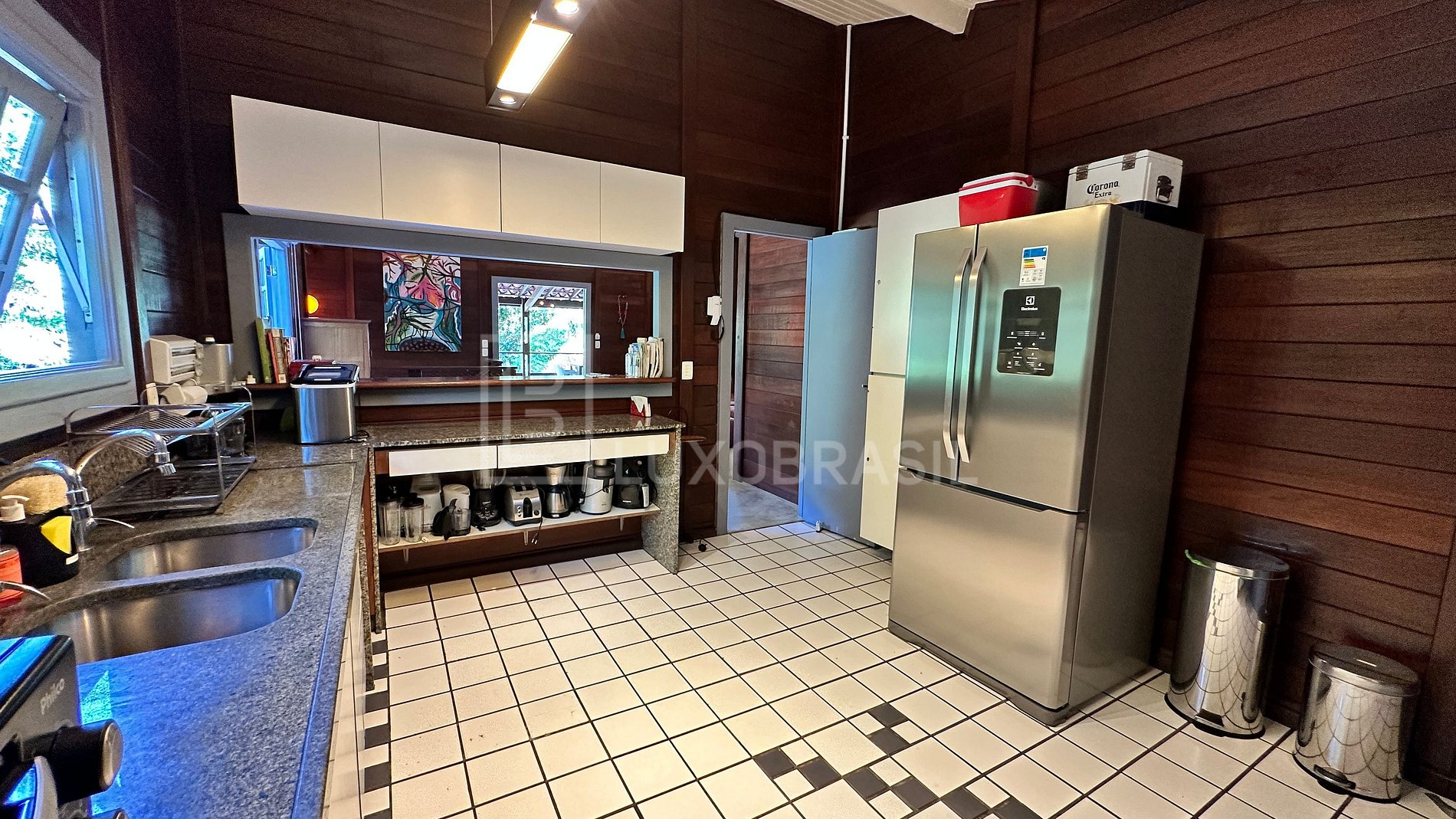 1st floor - Garden with swimming pool, recently renovated, modernized with night lights, 400m2 of flat lawn overlooking the mountain (Pico dos Quatro), fruit trees, delicate landscaping and a charming Balinese gazebo. The house is surrounded by cozy verandas, has a large covered lounge with air-conditioning and retractable doors that can also be used for home-office or small meetings. There is a beautiful pergola made of Bamboo and Eucalyptus at the back of the house, decorated with lights and a beautiful mosaic panel. On this floor there are 2 toilets, a nespresso machine, a fridge, a beer cooler and a vintage cooler, in addition to the living furniture. The house provides yokes, towels, slippers, chairs and tents for the beach and pool at no extra charge.