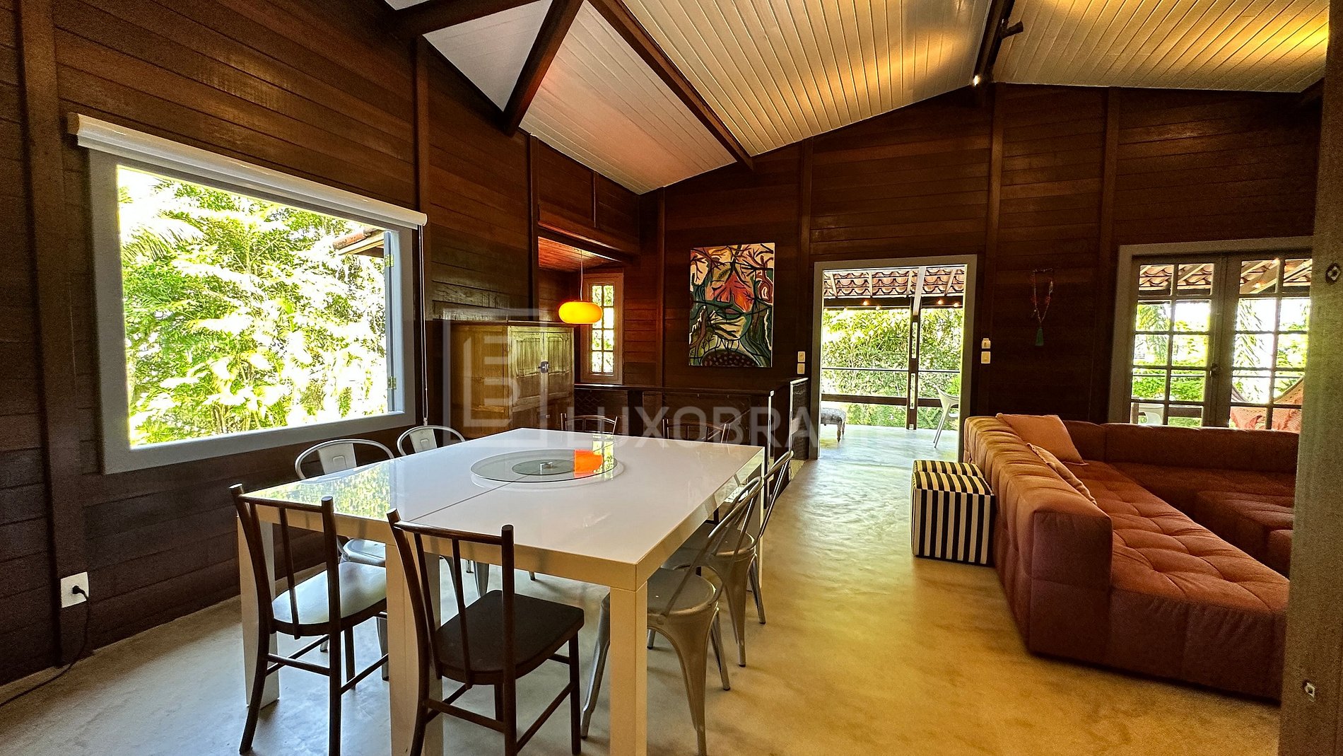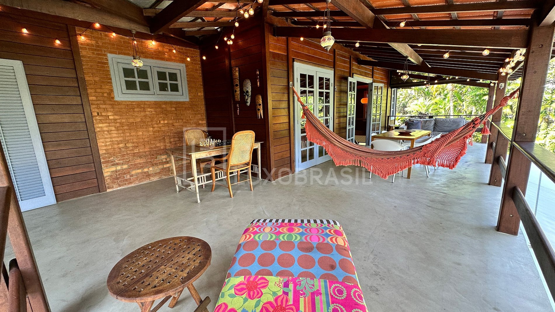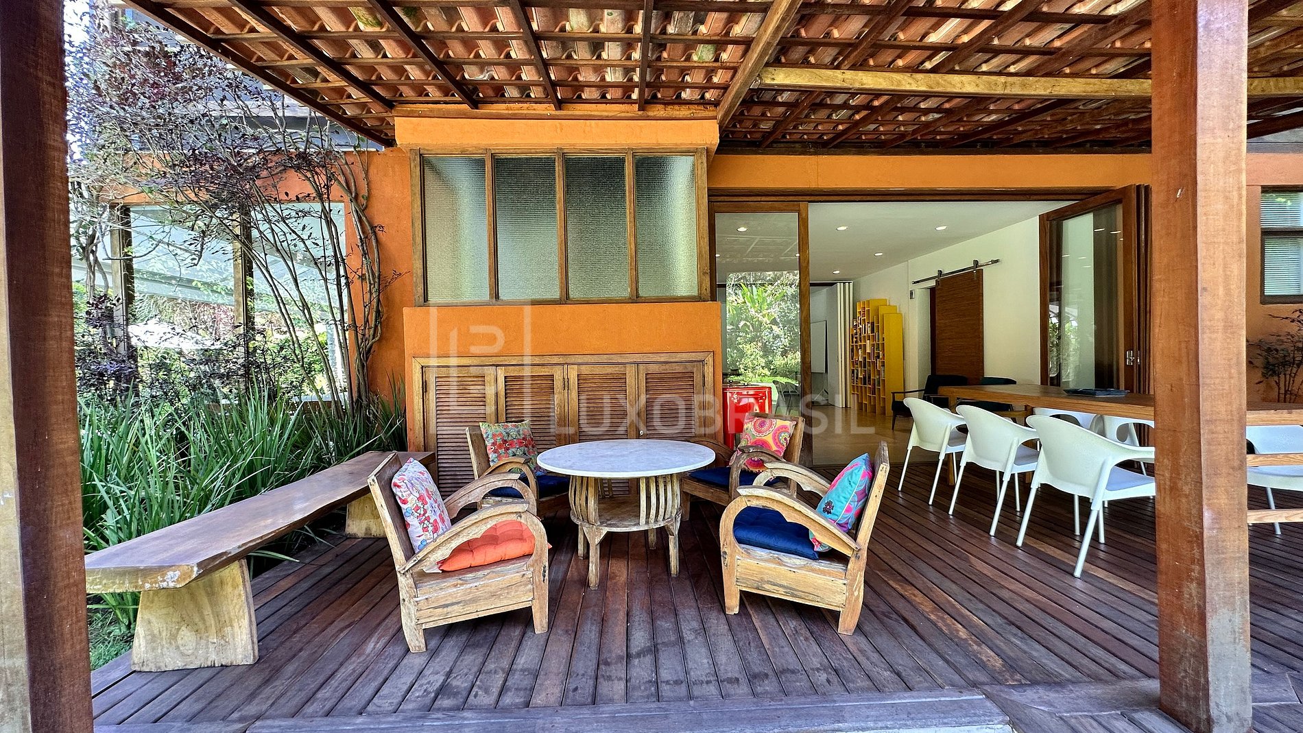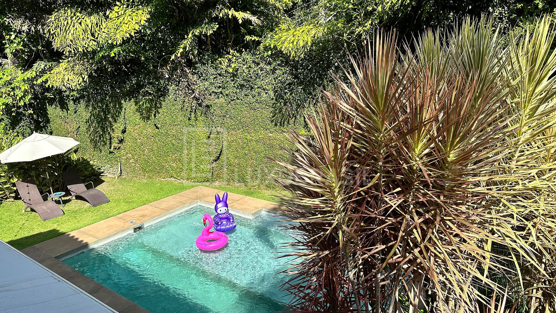 1st floor - Garden with swimming pool, recently renovated, modernized with night lights, 400m2 of flat lawn overlooking the mountain (Pico dos Quatro), fruit trees, delicate landscaping and a charming Balinese gazebo. The house is surrounded by cozy verandas, has a large covered lounge with air-conditioning and retractable doors that can also be used for home-office or small meetings. There is a beautiful pergola made of Bamboo and Eucalyptus at the back of the house, decorated with lights and a beautiful mosaic panel. On this floor there are 2 toilets, a nespresso machine, a fridge, a beer cooler and a vintage cooler, in addition to the living furniture. The house provides yokes, towels, slippers, chairs and tents for the beach and pool at no extra charge.