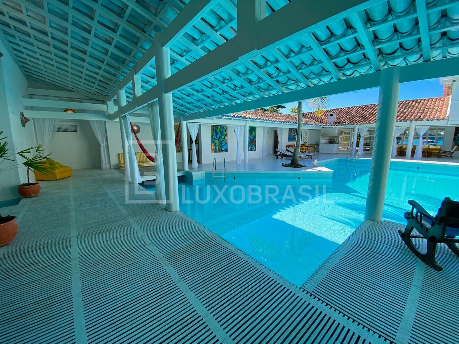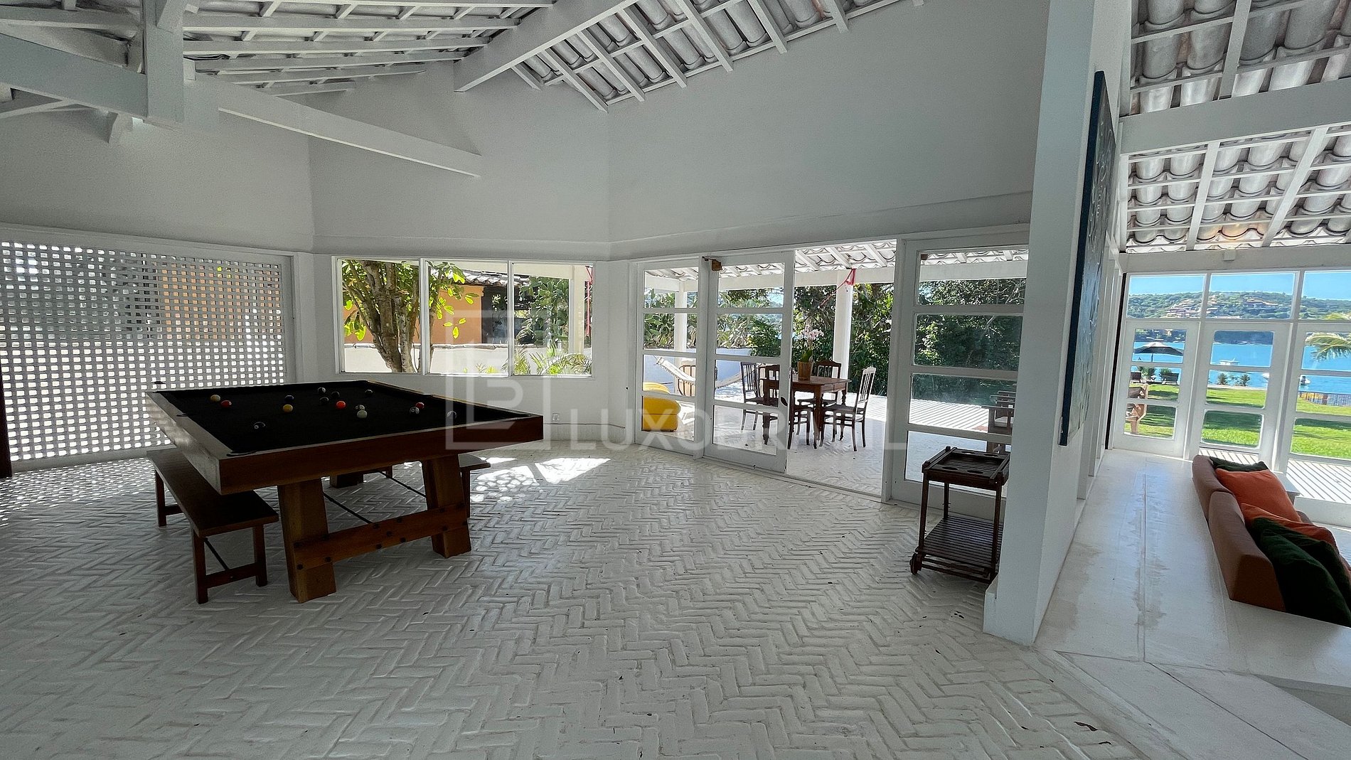 The house has five bedrooms, three of which are suites, all air-conditioned, spacious living room, TV room with cable channels and Netflix, with a comfortable sofa bed, dining room with three environments, complete kitchen with all utensils. Outside, you will find a spacious veranda with hammock, and a beautiful view to the sea, a beautiful swimming pool, sun loungers, gourmet area with barbecue grill, dry sauna with two showers, and game room with pool table.