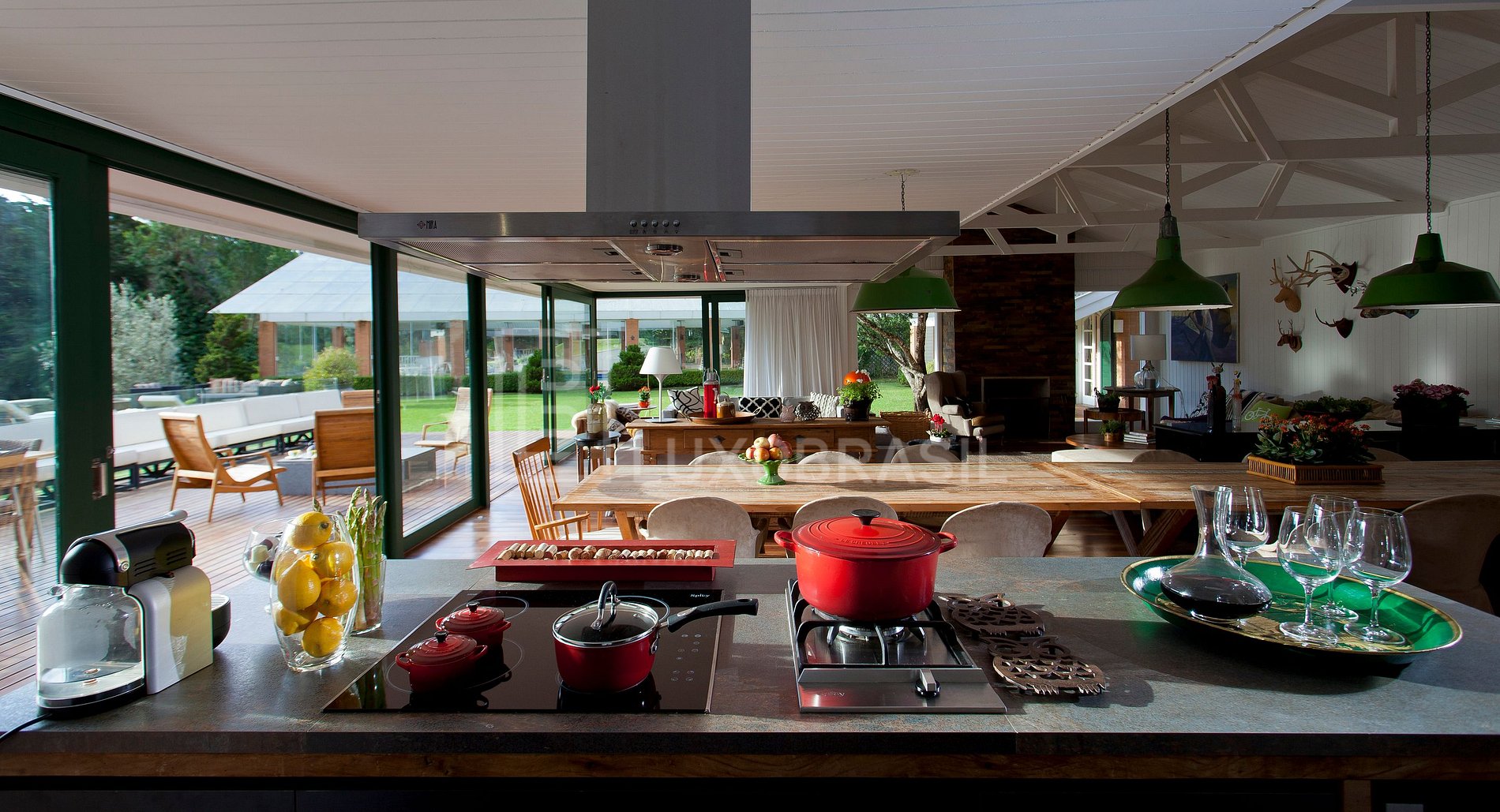 The main living room has a beautiful view of the forest and is integrated into the gourmet space, perfect for gathering friends.