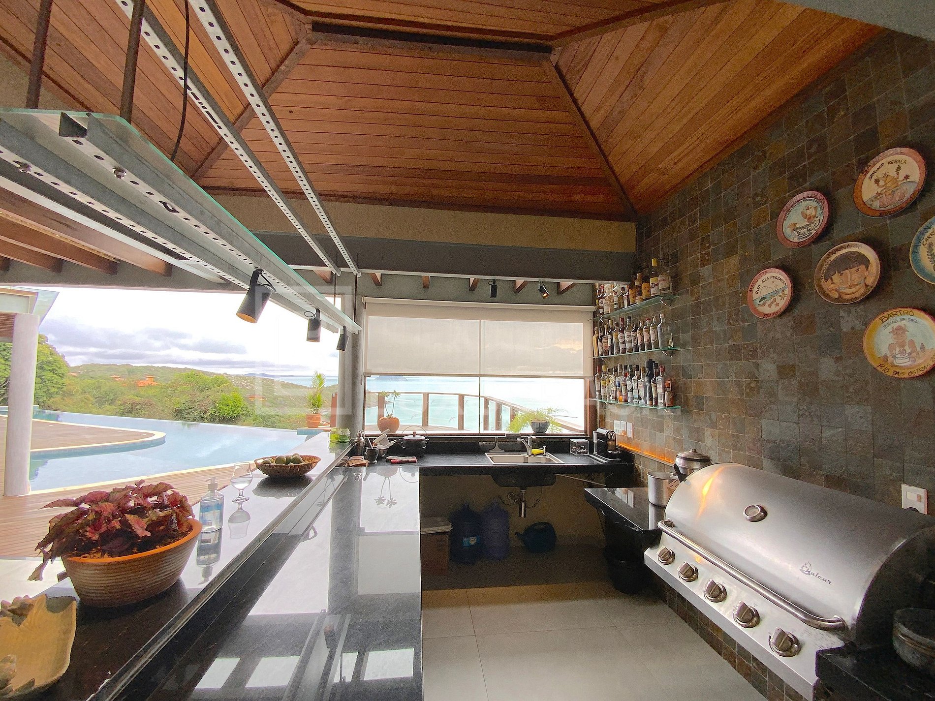 The outdoor area has a large veranda with a dining table, an infinity-edge swimming pool, a gourmet area with a barbecue, a pizza oven and a bar, giving you a fantastic view during your leisure time.