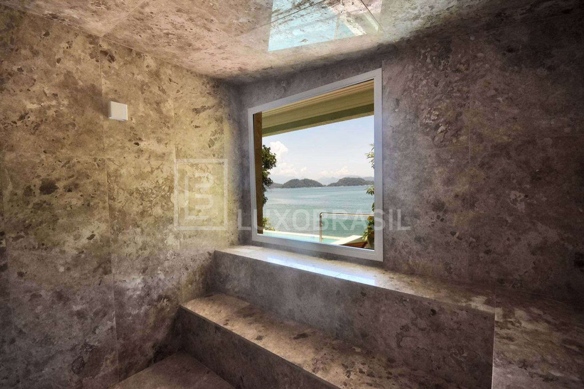 Its privileged outdoor area overlooking the sea, with swimming pool and sun loungers, gourmet area with barbecue and beautiful table for 10 people, balcony with lounge and table, sauna all in marble. It still has access to the beach, deck for nautical support, a beautiful chapel and ecological trail.