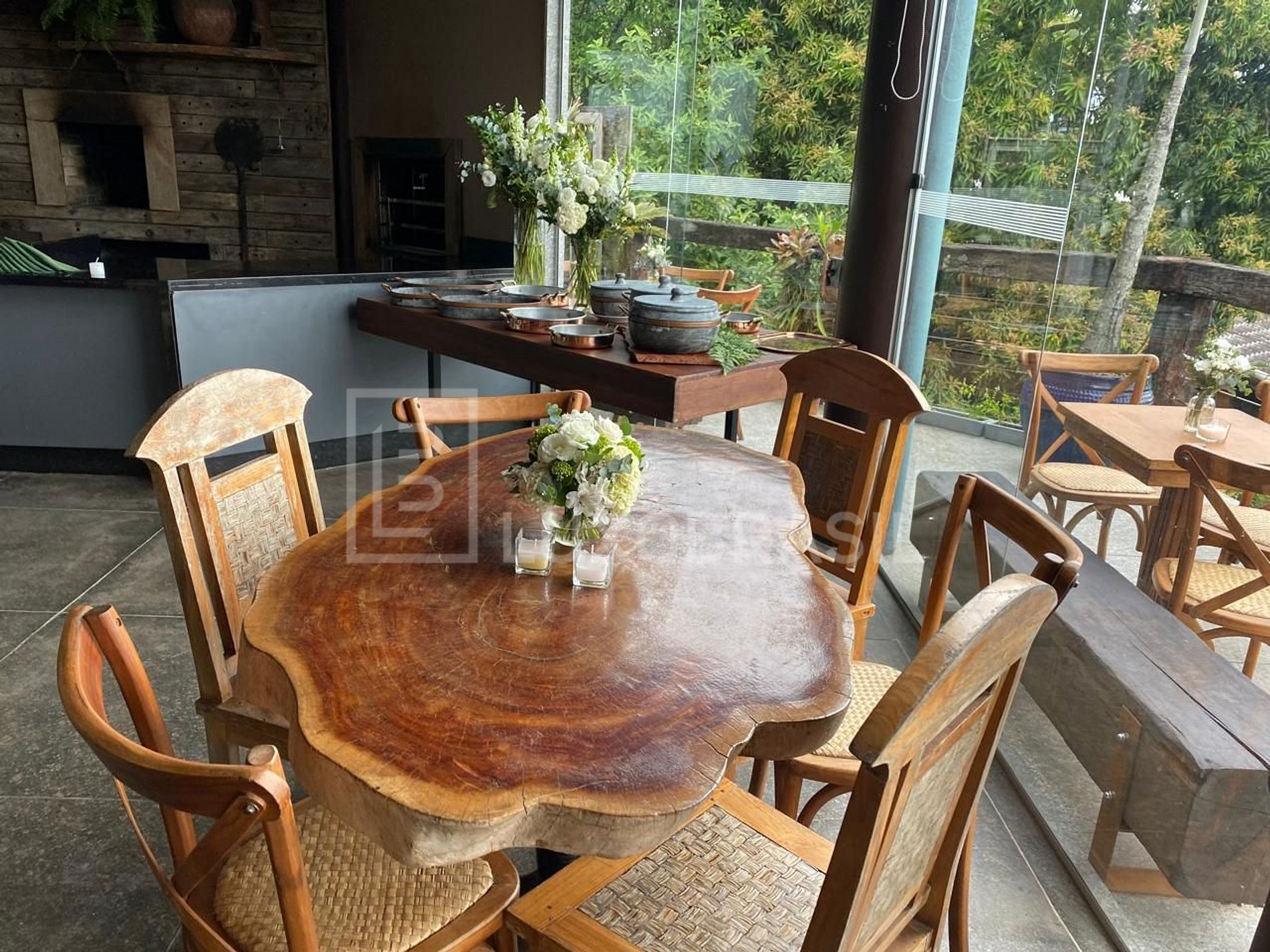 With a high standard rustic style project, with native stones, glass wood and a beautiful panoramic view of the islands and sea of Barra da Tijuca. The furniture accommodates up to 06 people comfortably in its 02 available rooms. The sidewalk for the event has a beautiful swimming pool with waterfall, sauna, gourmet space with barbecue and fire pit, vast green area, video room, living room, ample space with tables and chairs, social bathroom, terrace with panoramic view and an elevator. The space is 100% equipped, comfortable and spacious, suitable for small events, as well as photoshoots and filming. Ideal for lunch or dinner: fully equipped kitchen with barbecue and wood stove, wine cellar and beer. Perfect for a day of photos and recordings, with different views and light, also ideal for a wedding day. The space has an elevator and has two suites and a dry sauna.