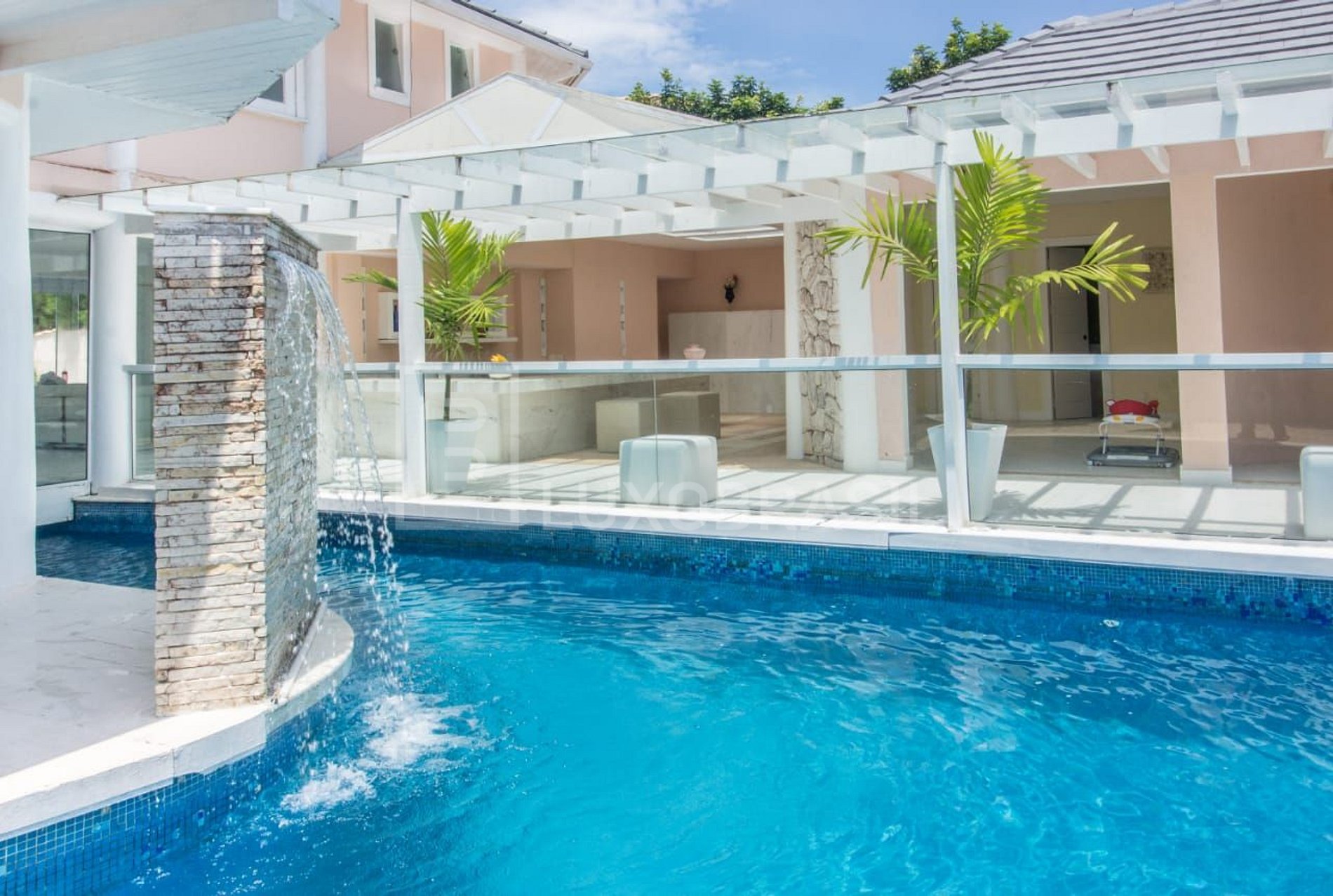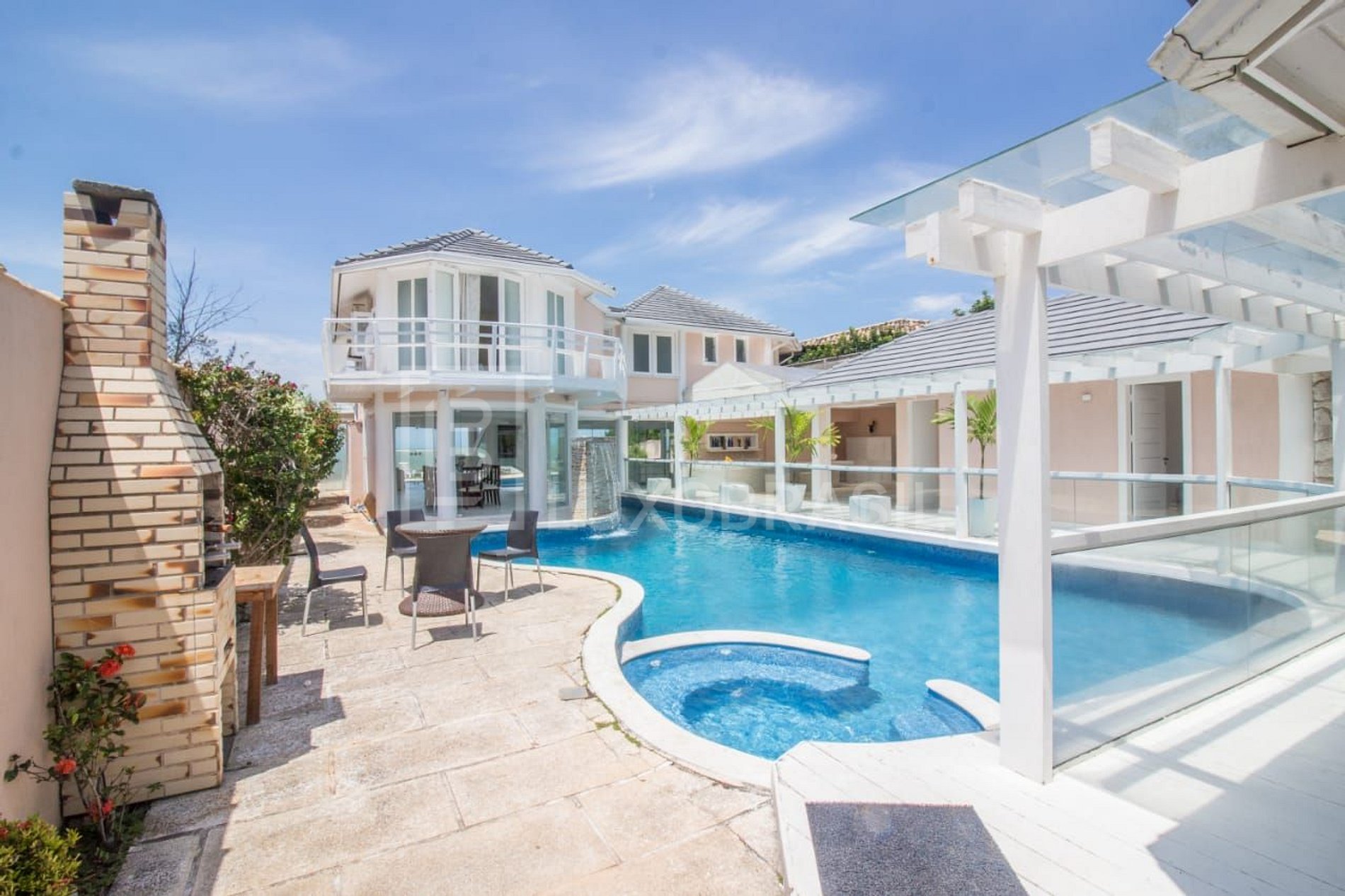 The outdoor area has a beautiful whale-shaped swimming pool that connects to the inside of the house, a jacuzzi, a spacious veranda and a barbecue area.