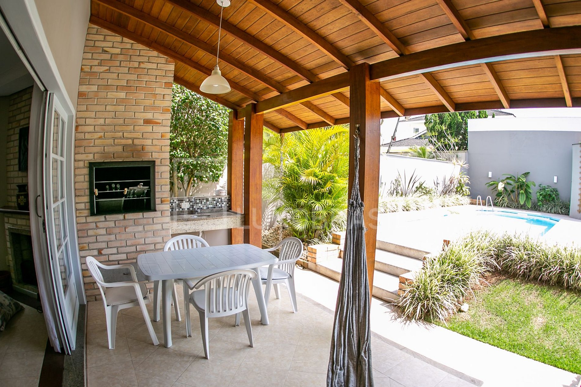 The house has an incredible leisure area with swimming pool, table, sun loungers and barbecue area with barbecue utensils.