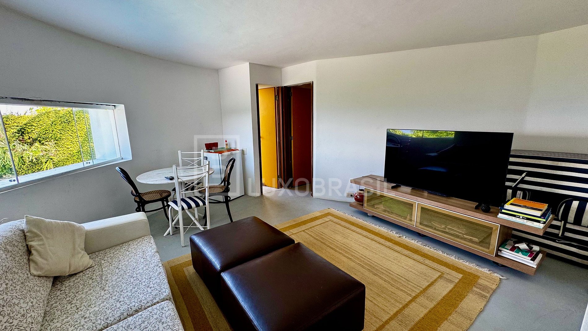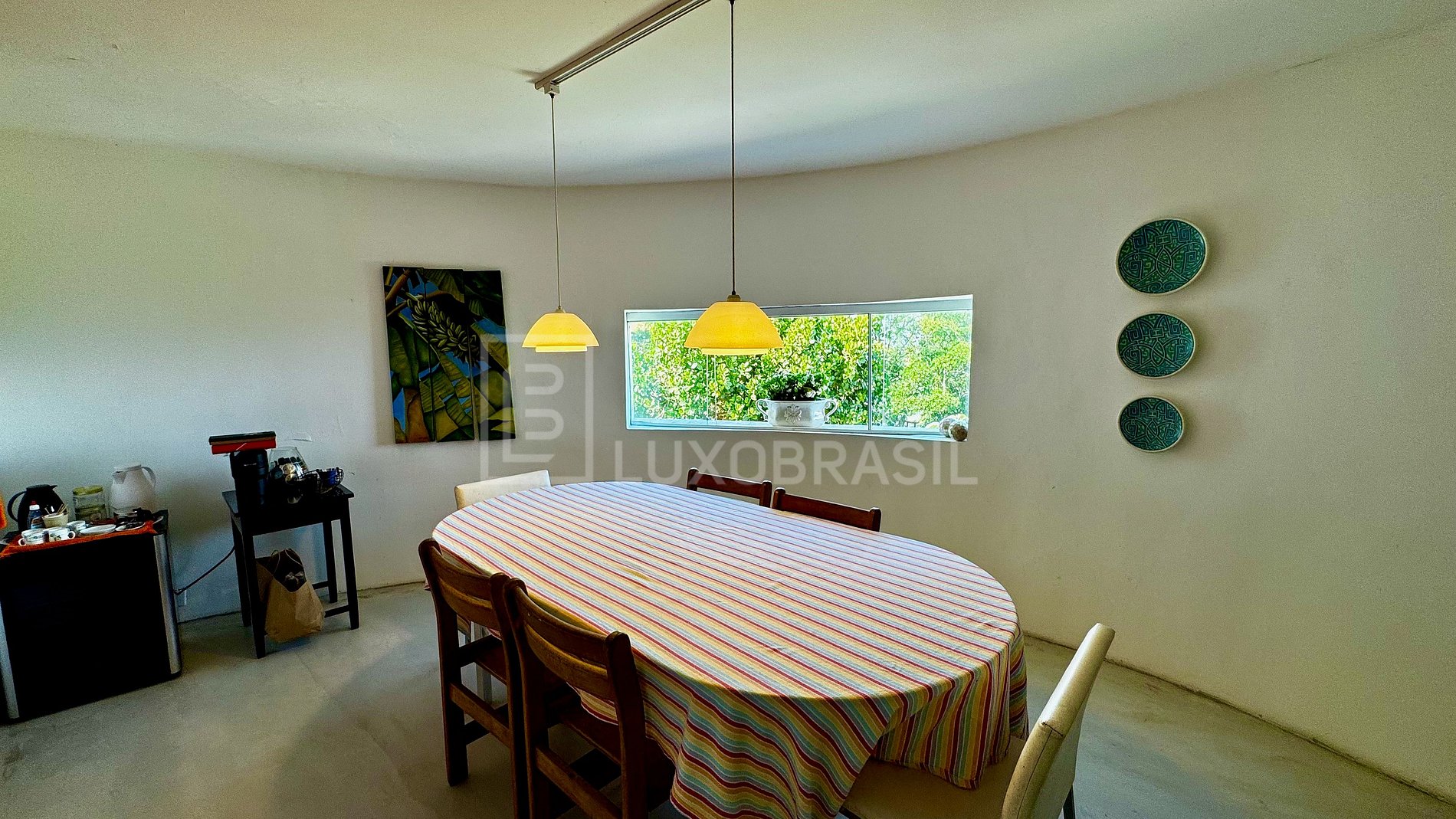 A casa conta com um amplo salão principal, decorado com elementos em madeira e um imponente janelão de vidro que emoldura a natureza ao redor, proporcionando luz natural abundante durante todo o dia.