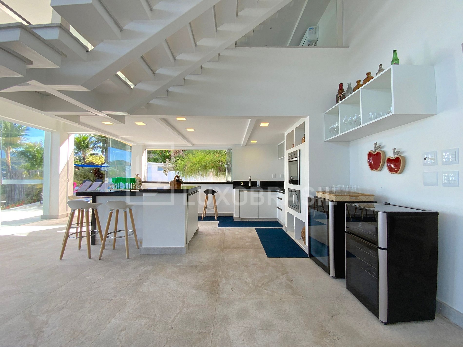 The living room has a Home Theater and dining table, large windows, allowing plenty of natural light. It also has a pool table and ping-pong, toilet and integrated gourmet kitchen. Fully equipped kitchen with modern appliances and ice machine. Wonderful outdoor area with swimming pool, shared whirlpool inside the sauna, gas and charcoal grill, private beach, deck and pier.