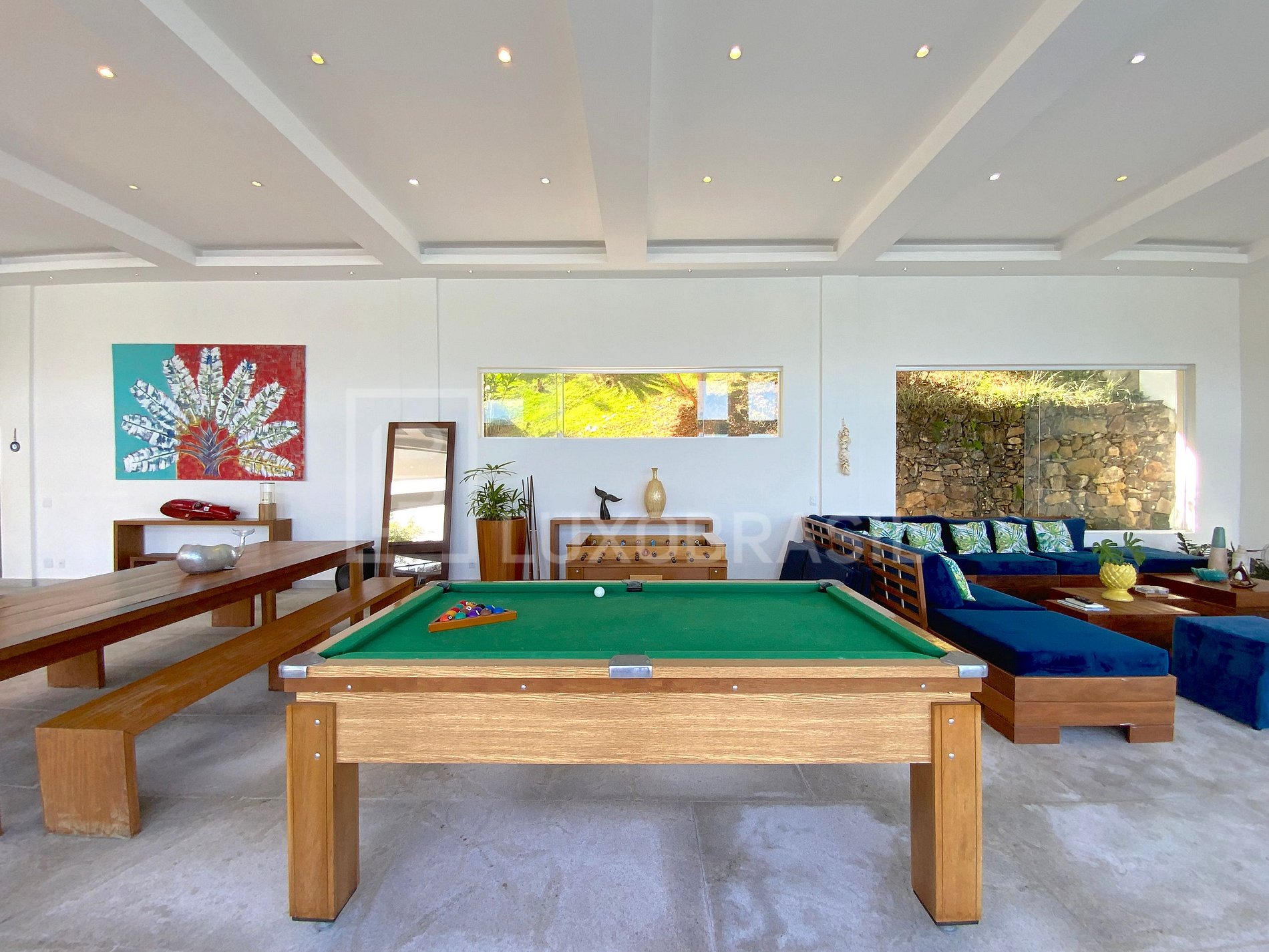 Localizada no prestigiado Condomínio Caieirinha, a mansão oferece total segurança por terra e mar e é rodeada por águas cristalinas. Dispõe ainda de estrutura para pouso de helicópteros.