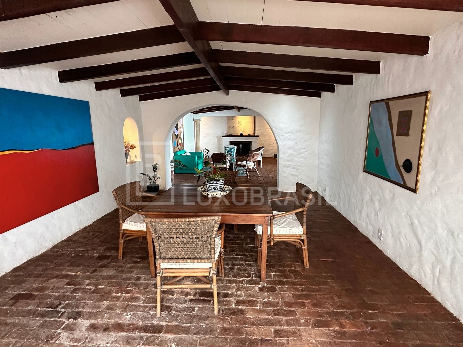 Descendo as escadas logo após o Hall de entrada um salão majestoso se desdobra em quatro áreas distintas. A sala de estar integrada à sala de jantar é o epicentro do entretenimento sofisticado. A lareira adiciona uma pitada de aconchego, ligando a sala de jantar e há uma fonte que da todo o charme ao ambiente, enquanto as varandas oferecem vistas deslumbrantes do oceano.