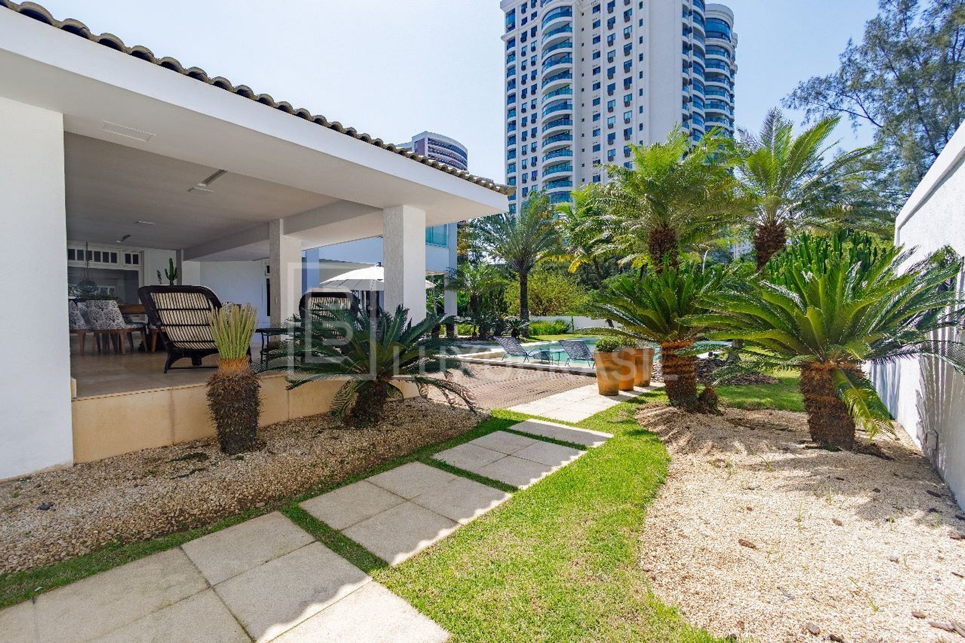 A entrada é marcada por um jardim meticulosamente cuidado, onde uma piscina com hidromassagem e um amplo solário convidam para momentos relaxantes ao ar livre. Uma espaçosa varanda, dividida em três ambientes, oferece vistas deslumbrantes do exuberante jardim, proporcionando um cenário ideal para desfrutar de refeições ao ar livre e encontros memoráveis com amigos e familiares.