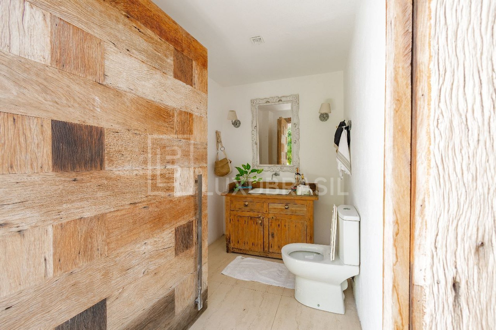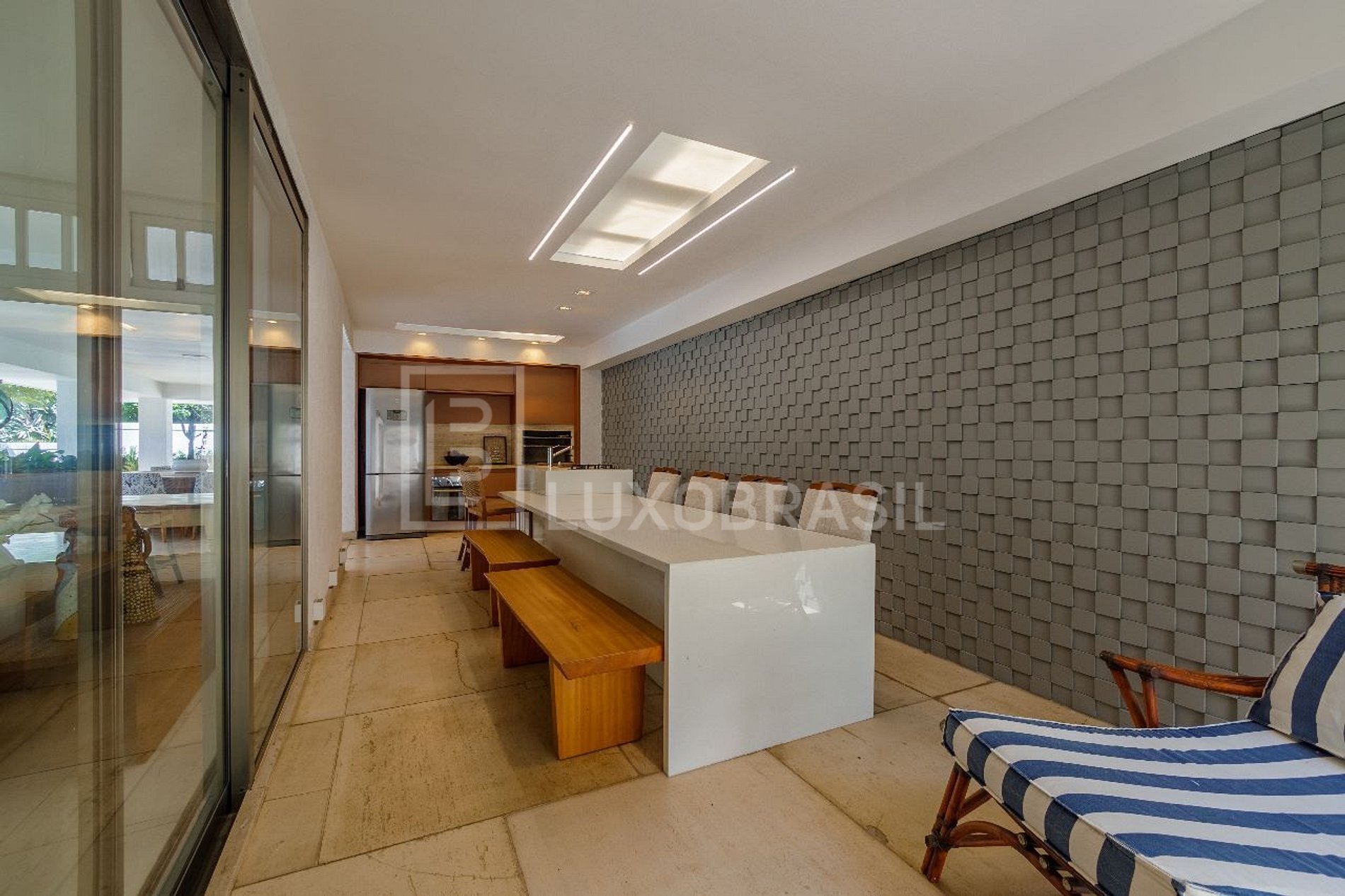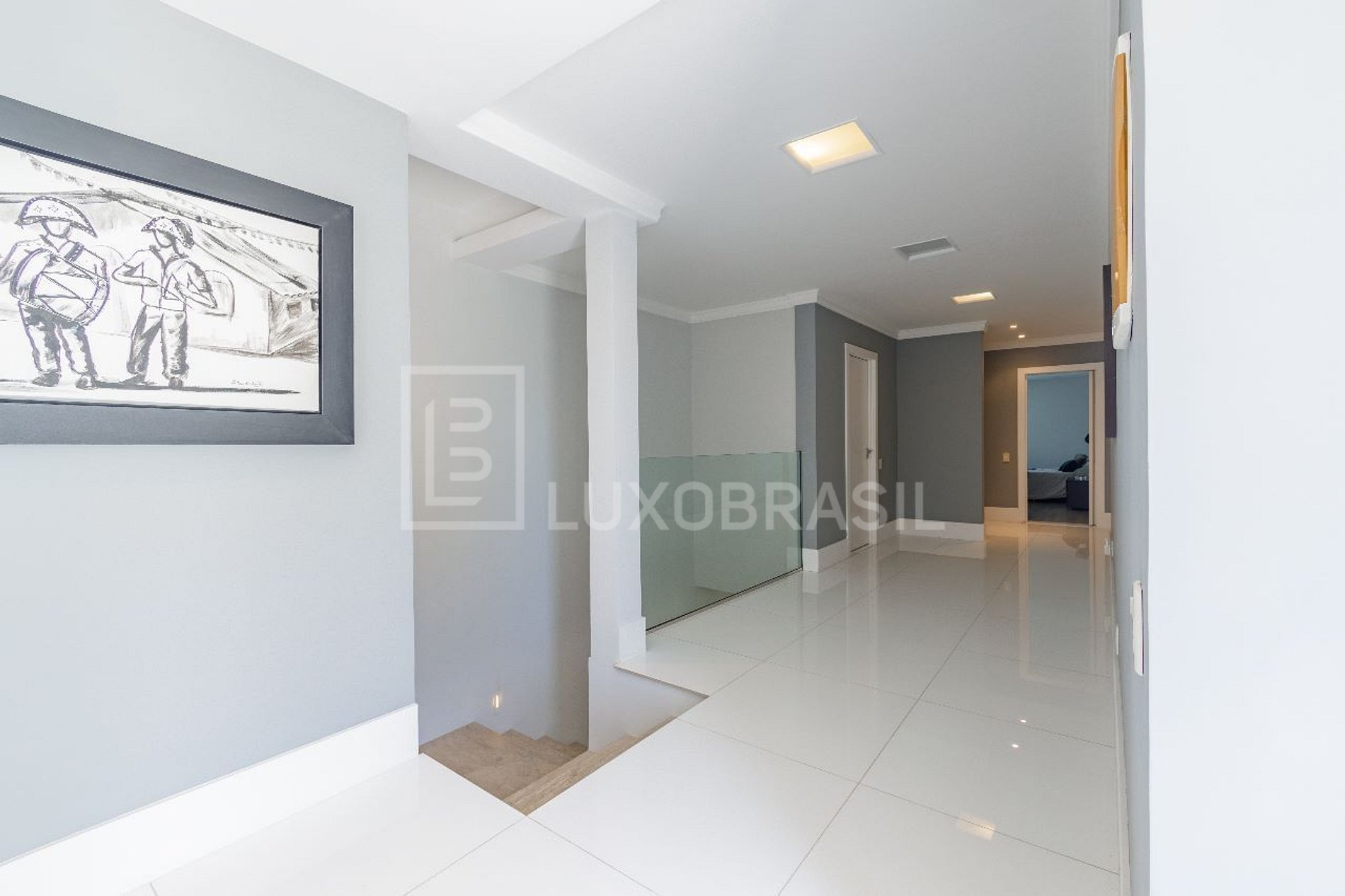 No interior, o imóvel revela um padrão incomparável de luxo e sofisticação. O acabamento em travertino confere uma elegância atemporal a cada espaço. O hall principal recebe os visitantes com sua imponência, enquanto um lavabo convenientemente localizado atende às necessidades dos convidados.