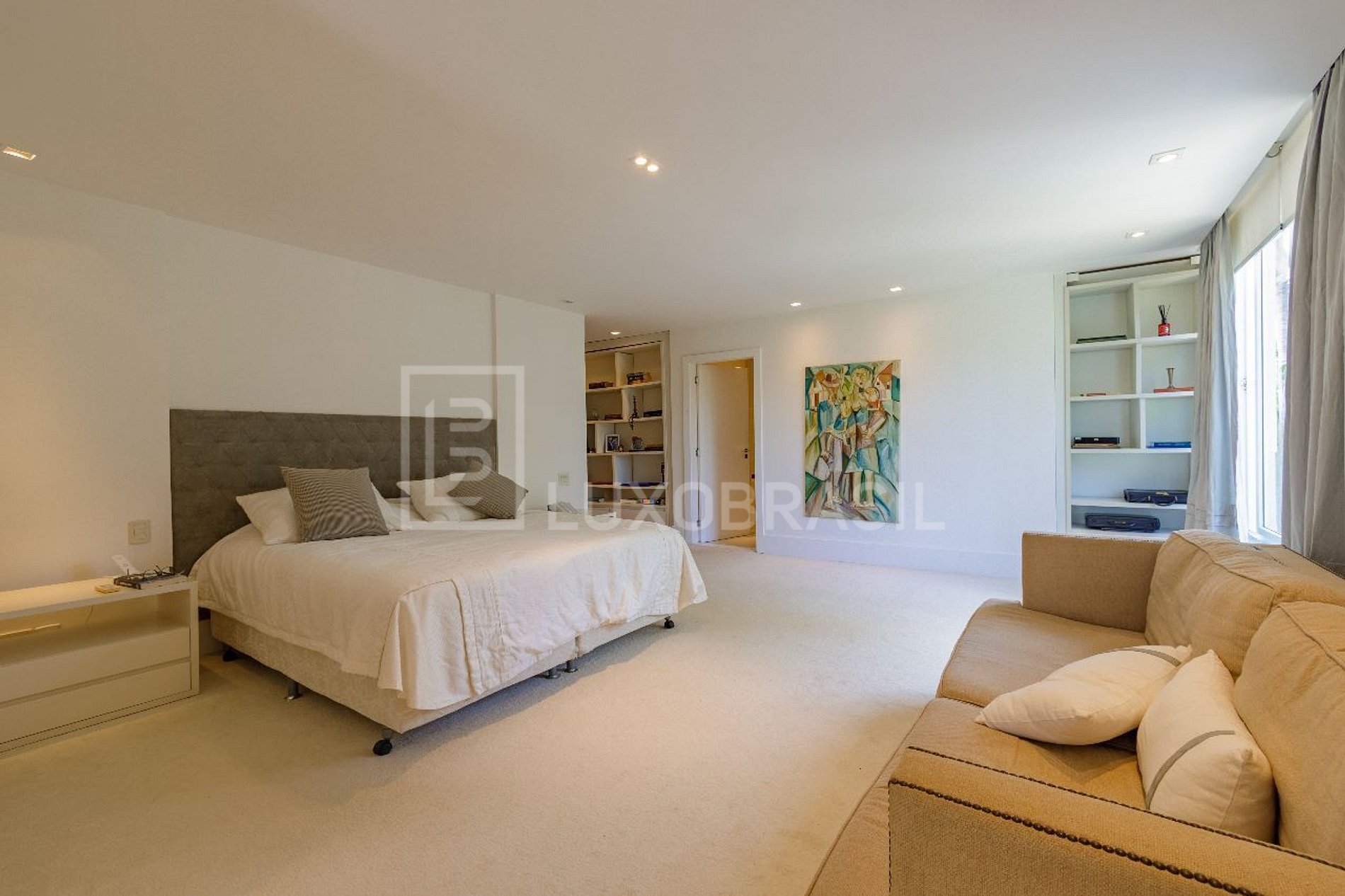 Um estúdio em mezanino oferece uma área versátil que pode ser adaptada como escritório ou sala de estudos. A casa dispõe de quatro suítes, cada uma com seu próprio charme e elegância distintos. A suíte master, espaçosa e luxuosa, inclui um escritório privativo, proporcionando um ambiente tranquilo para trabalho em casa.