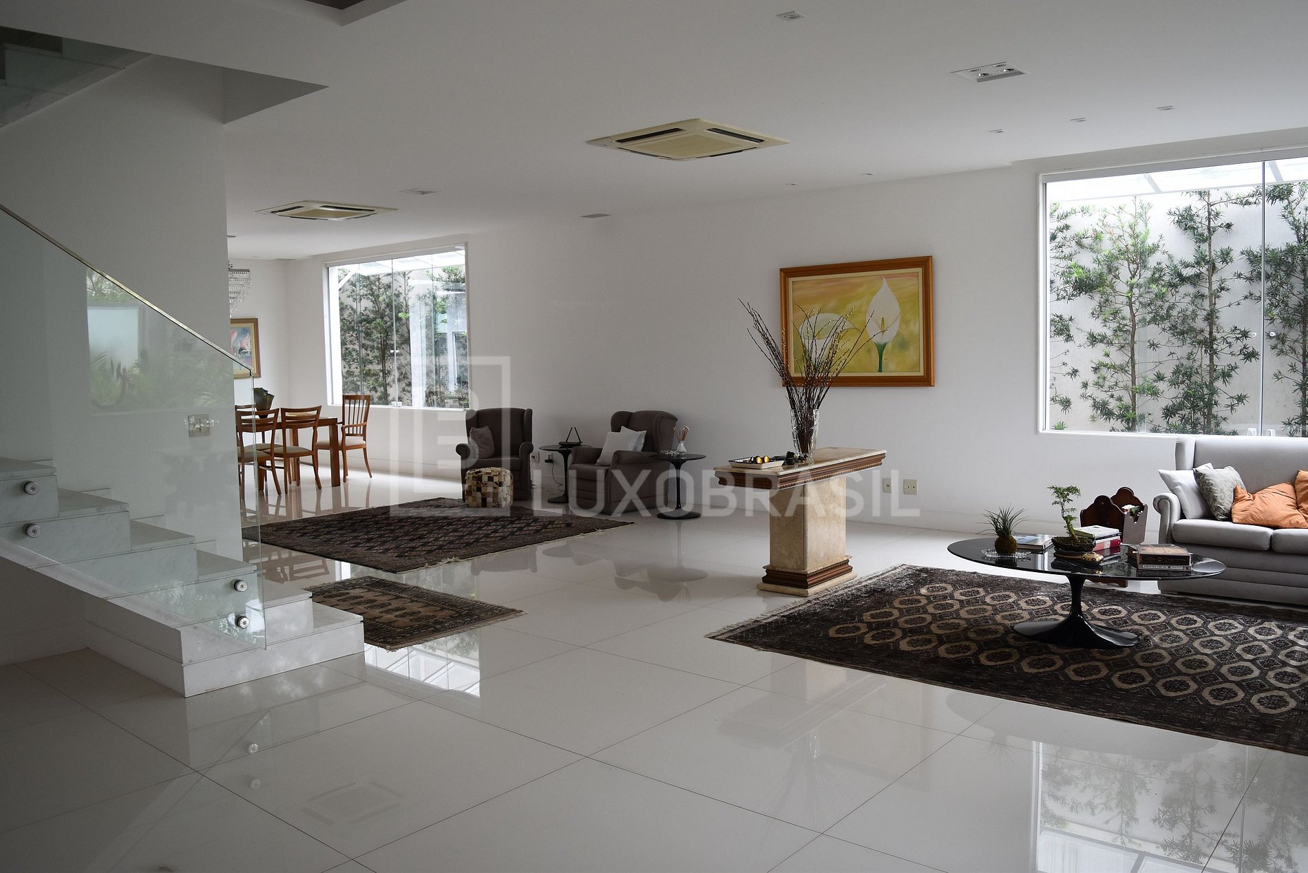 Incredible house in one of the best and most luxurious condominiums in Barra da Tijuca — Condomínio Del Lago. This spacious and airy 600 m² home features 4 large suites, all equipped with split air-conditioning units, a living room with Hitachi air-conditioning, dining room, guest toilet, fully equipped kitchen with service area, and a home theater.
