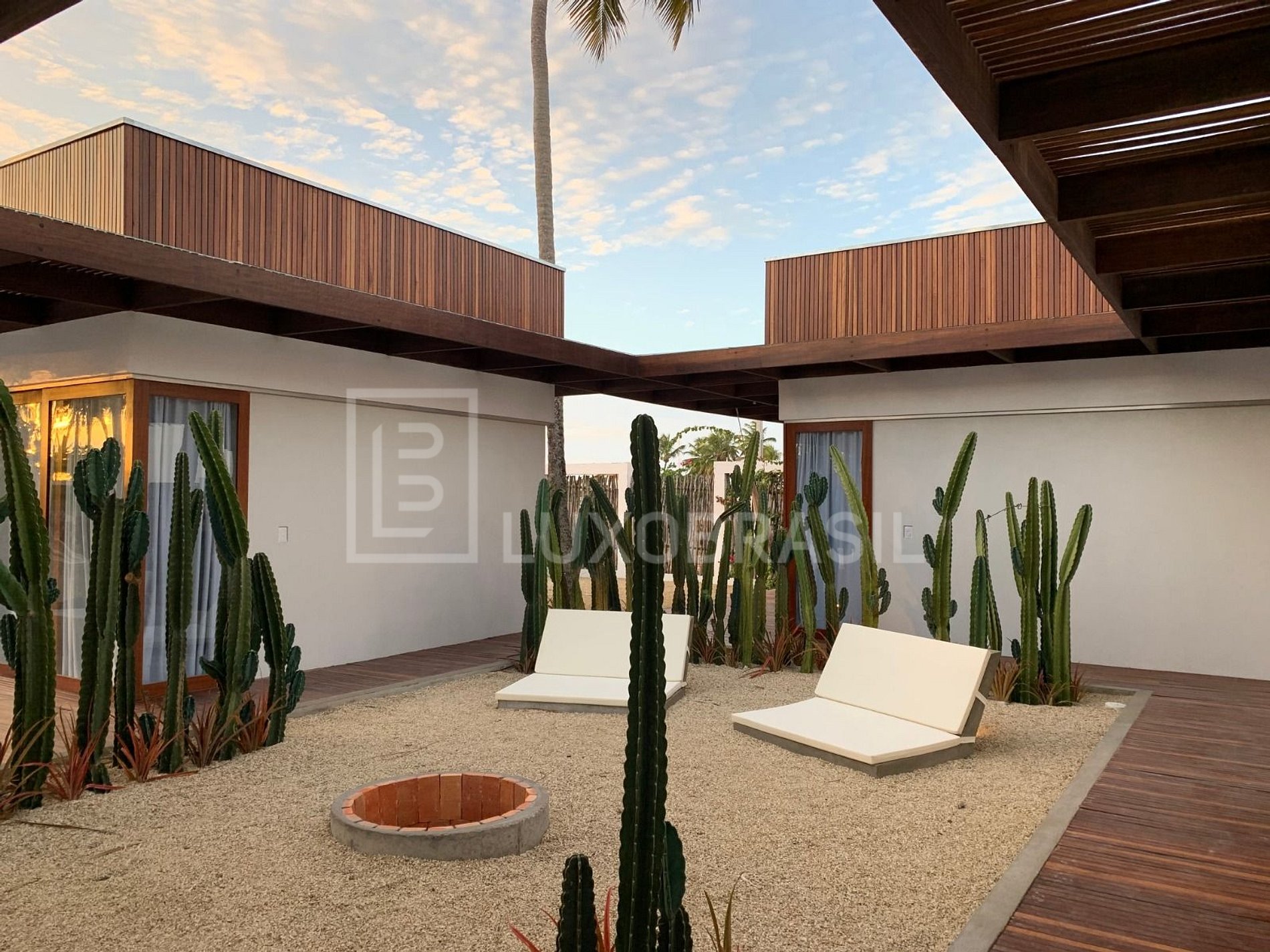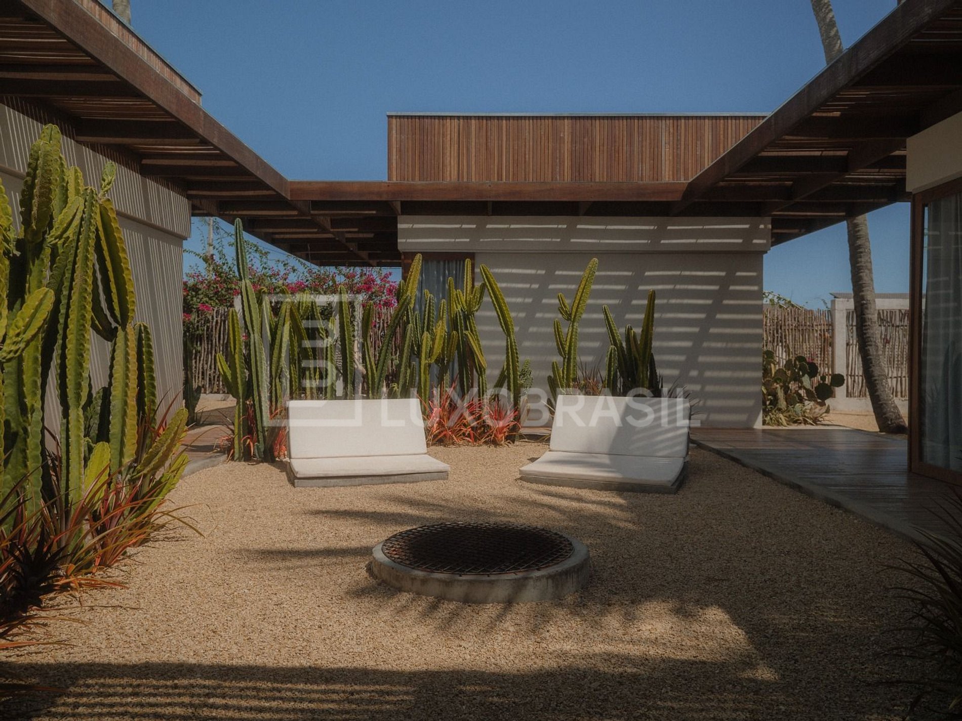 The residence offers a wide range of amenities, including a private pool, yoga area and gym with a variety of equipment. There is also a patio with cacti and a central fireplace next to the pool.
