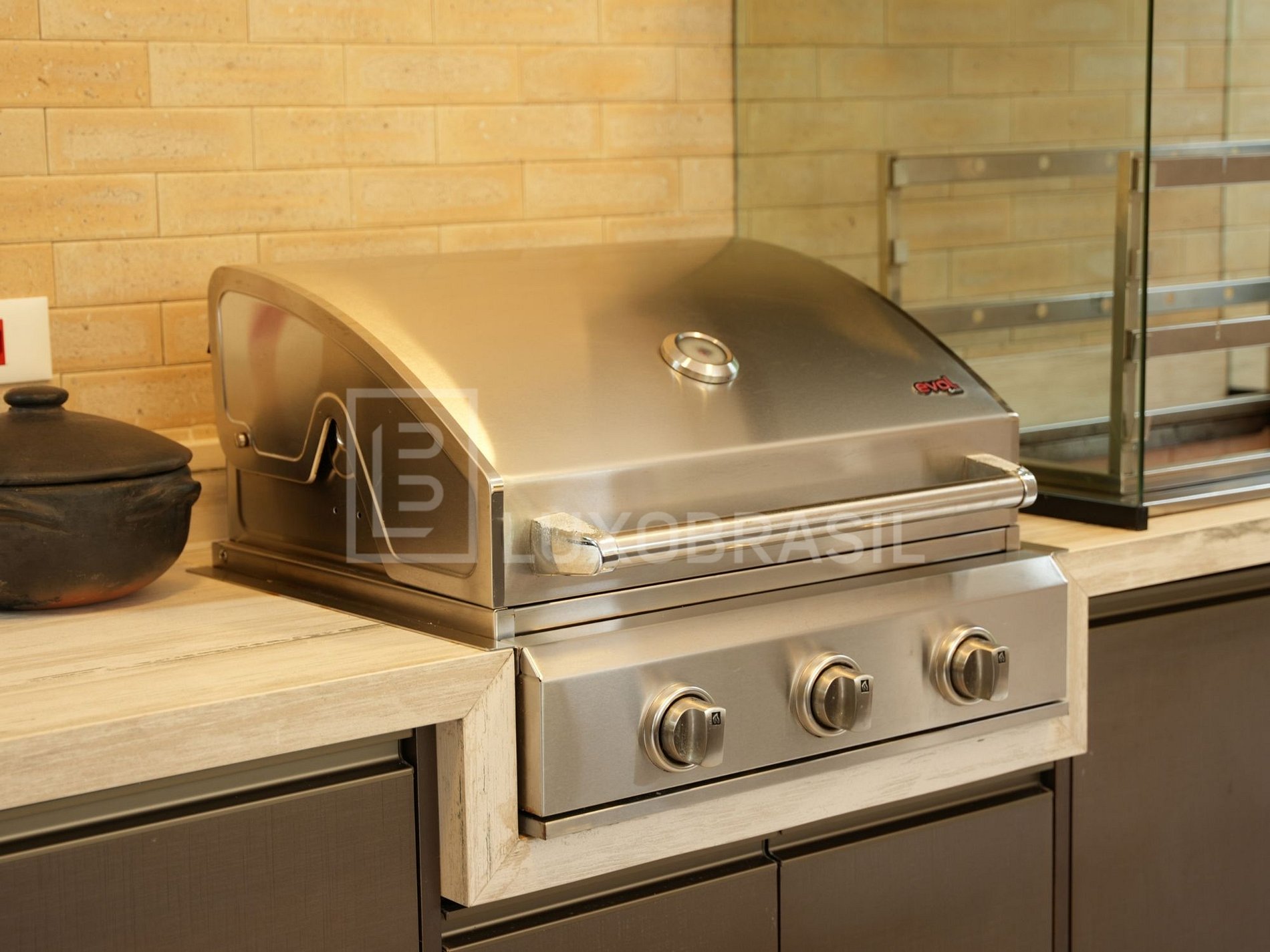 The gourmet space is a true highlight, featuring a barbecue grill, rotisserie, and industrial stove – perfect for leisure moments. The view of the heated pool and lush garden completes the scene, offering the ideal setting to relax and enjoy.