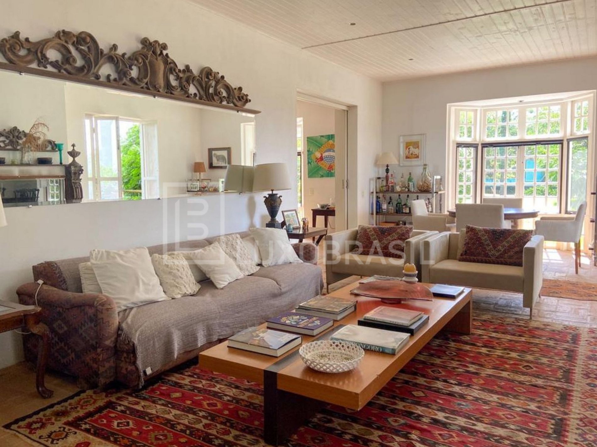 A casa principal é composta por seis quartos, sendo três suítes, e dispõe de cinco banheiros, escritório, living, sala de estar, sala de jantar, copa, cozinha, despensa e garagem com capacidade para três carros. O imóvel também conta com uma casa de caseiro e um canil.
