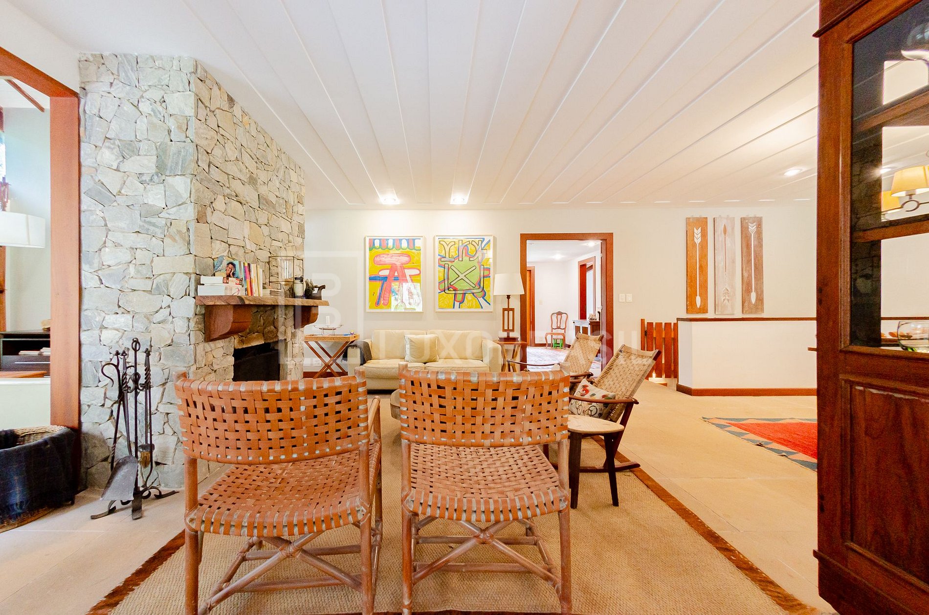 A casa dispõe de cinco quartos, sendo quatro suítes espaçosas, além de um banheiro social. A área social é composta por uma acolhedora sala de estar com lareira, perfeita para as noites mais frescas da serra, uma elegante sala de jantar e lavabo. A cozinha, totalmente equipada, integra praticidade e charme, complementada por lavanderia e um espaço dedicado para academia.