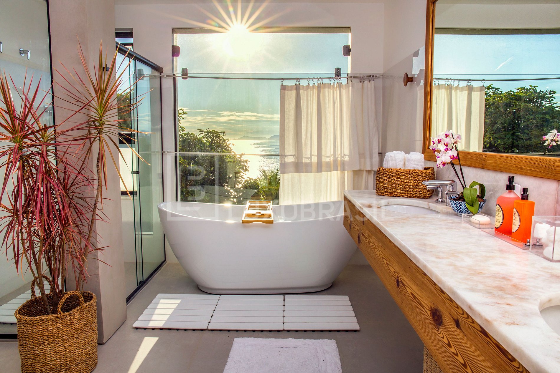 Île Suite - Habitación de 50 m² con vistas al mar en Joatinga, con impresionantes vistas panorámicas de las Islas Tijucas, donde podrá contemplar la salida y la puesta del sol. Cuarto de baño con vistas al mar, bañera, cabina de ducha y aseo.