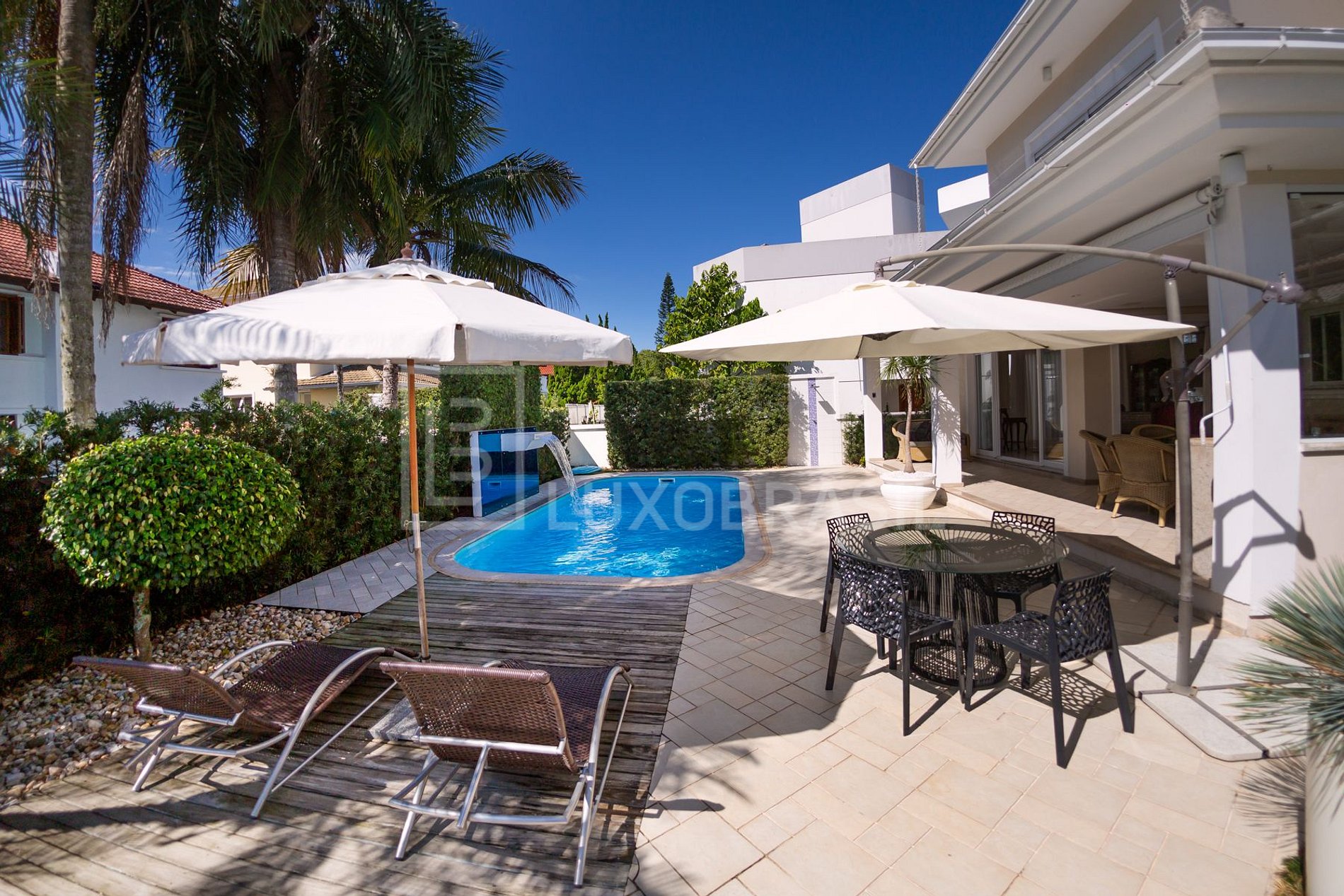 Barbacoa y zona de ocio integrada con la piscina en un entorno único y acogedor para aquellos que buscan lo mejor de los días de verano en Jurerê Internacional.