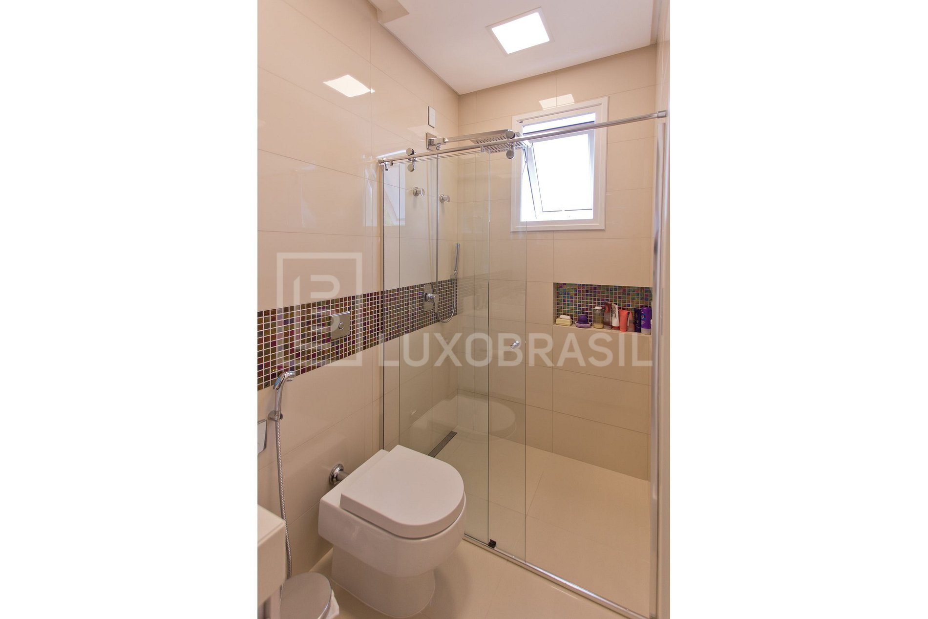O pé direito duplo do piso térreo, as amplas janelas e portas de vidro de correr propiciam amplitude e muito conforto. As quatro suítes ficam no piso superior, todas aconchegantes, com TV e bem decoradas.