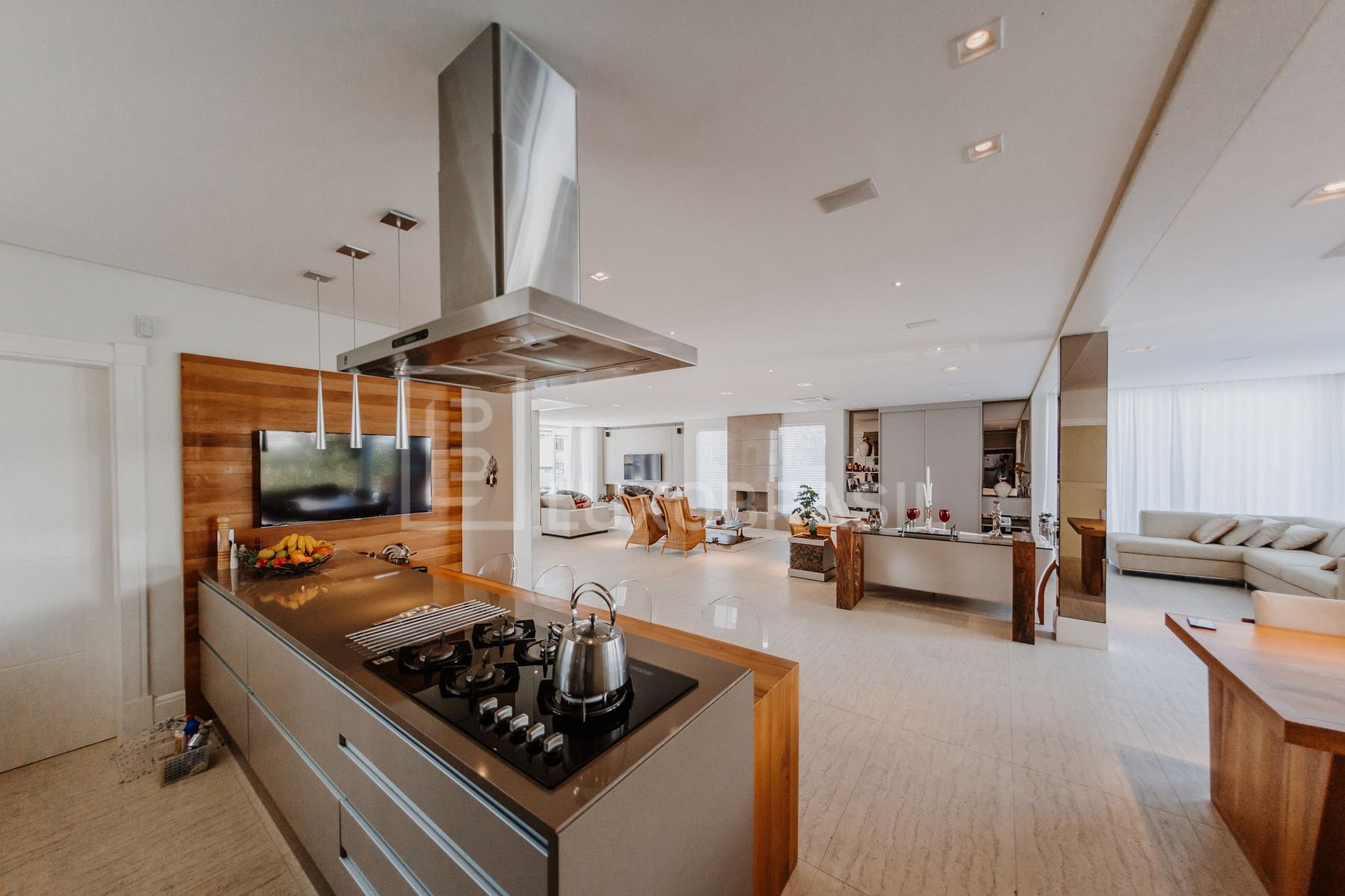 Em um único e extenso ambiente está o living room, sala de jantar e cozinha que fluem com leveza para a extraordinária área de lazer que oferece churrasqueira, jacuzzi para 8 pessoas e piscina com hidromassagem. As espreguiçadeiras, mesas e cadeiras do exterior compõe uma linda sintonia com a piscina e o paisagismo da casa.