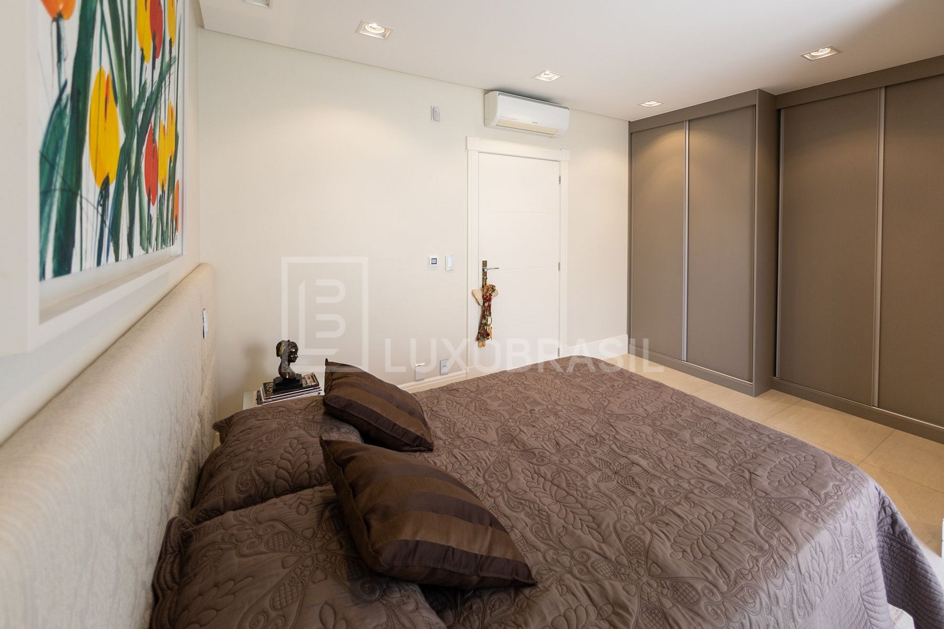 O pé direito duplo do piso térreo, as amplas janelas e portas de vidro de correr propiciam amplitude e muito conforto. As quatro suítes ficam no piso superior, todas aconchegantes, com TV e bem decoradas.