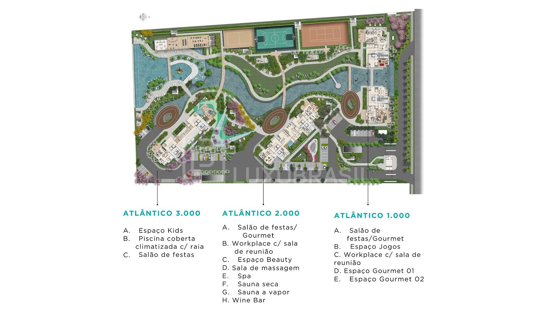 El condominio reúne más de 9.000 m² de áreas verdes y una estructura de ocio incomparable, con piscina infinita, spa, gimnasio by Cia Athletica, wine bar, espacio gourmet, canchas deportivas, kids club, coworking, pet place y el exclusivo Balsa Service a la Praia da Reserva.