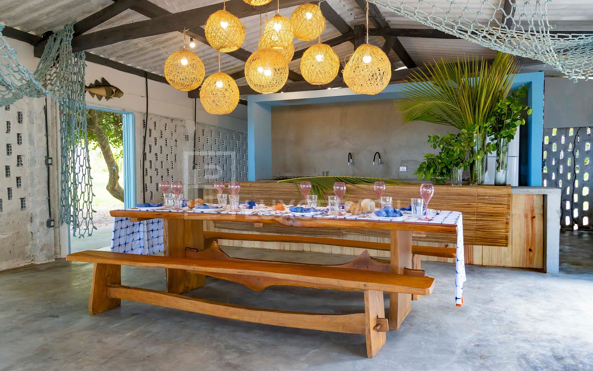 Hay una estructura al borde de la playa donde los huéspedes pasan el día. Tiene dos baños, una cocina y una mesa de comedor, con vistas al mar. Justo al lado, hay una cancha de tenis de playa y una hamaca.
