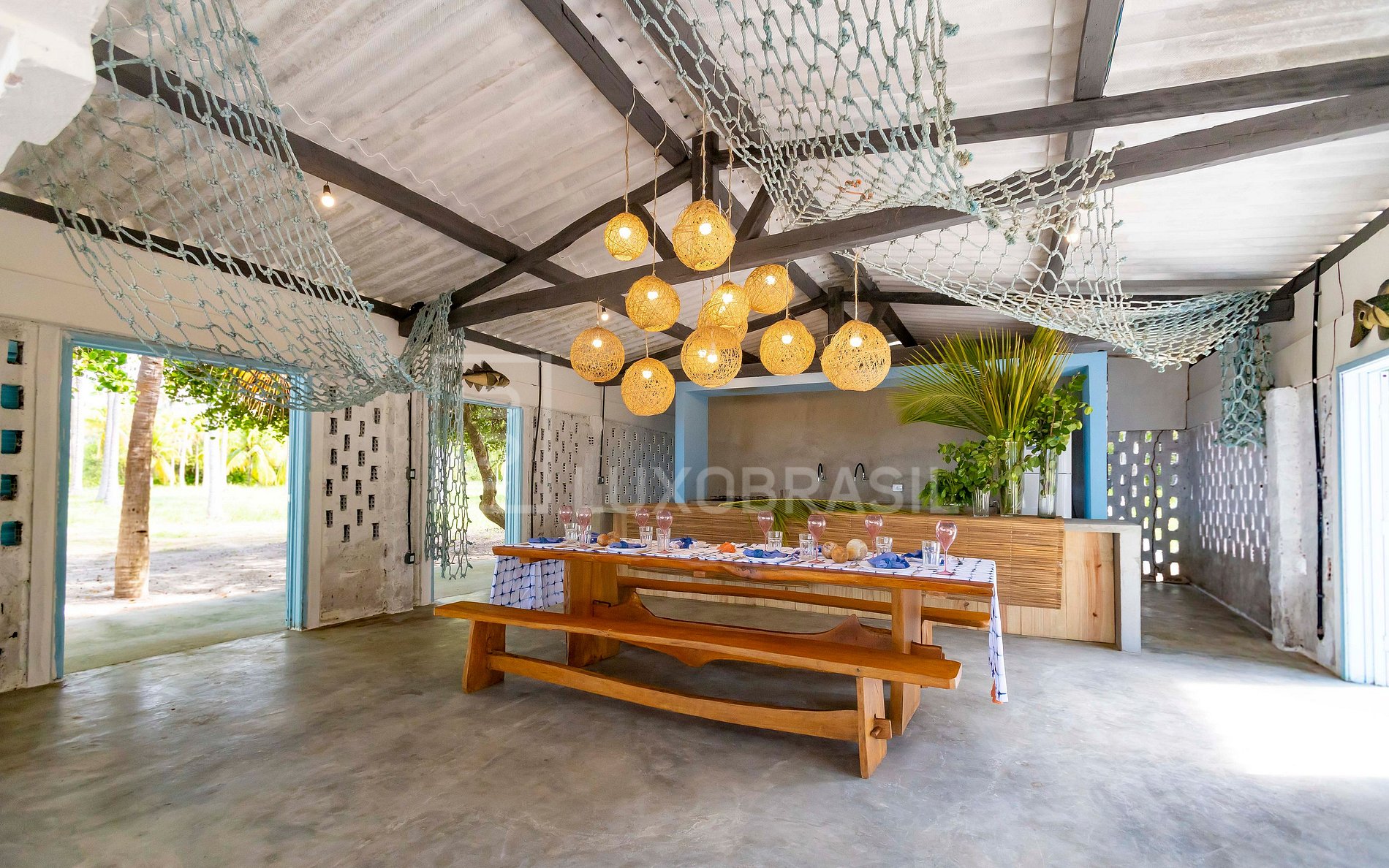 Hay una estructura al borde de la playa donde los huéspedes pasan el día. Tiene dos baños, una cocina y una mesa de comedor, con vistas al mar. Justo al lado, hay una cancha de tenis de playa y una hamaca.