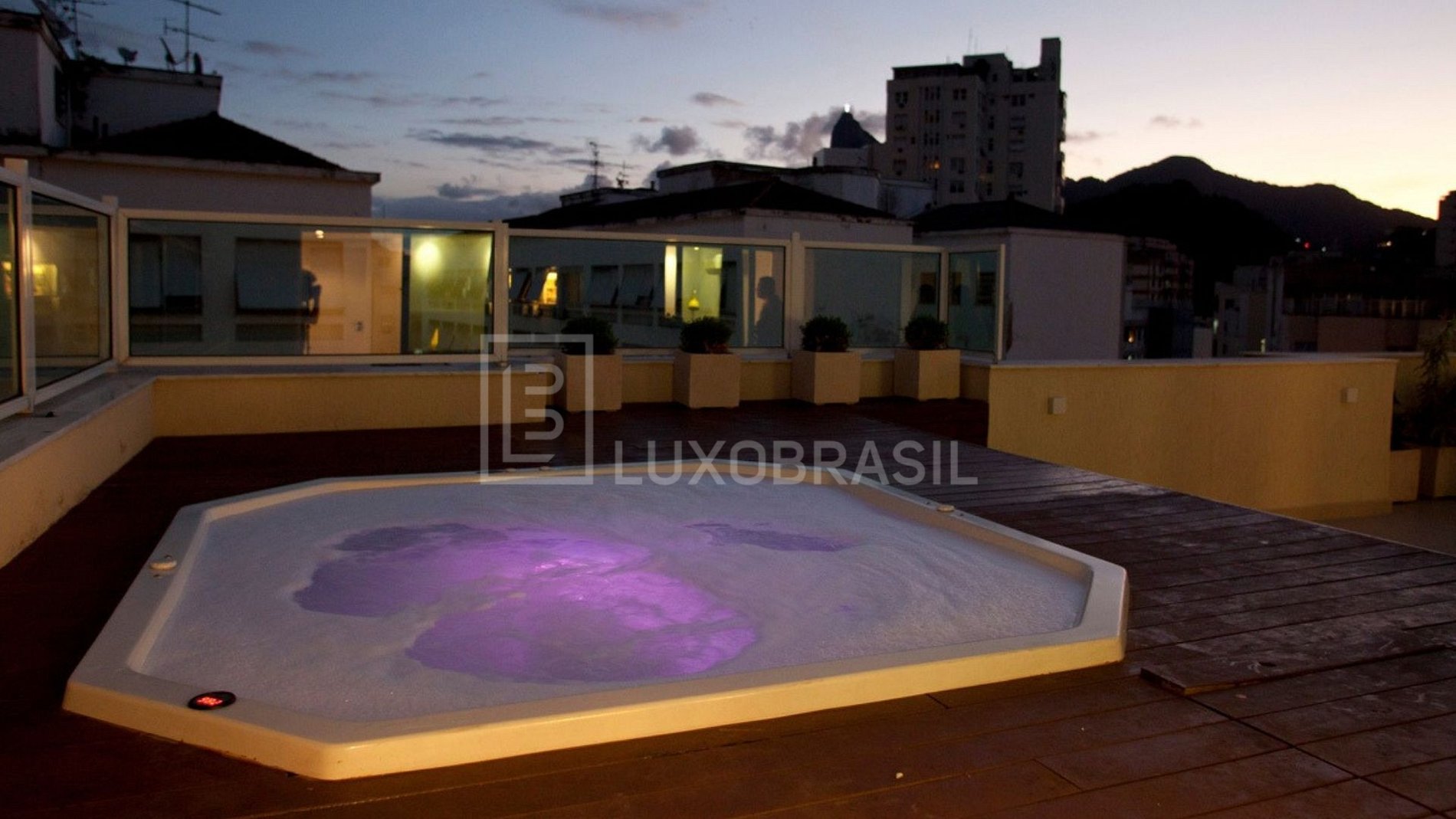 La terraza de 160 m² cuenta con piscina, jacuzzi, deck, área de comedor al aire libre y espacio para tomar el sol, con vistas a la Mata Atlántica y vistas distantes al Cristo Redentor.