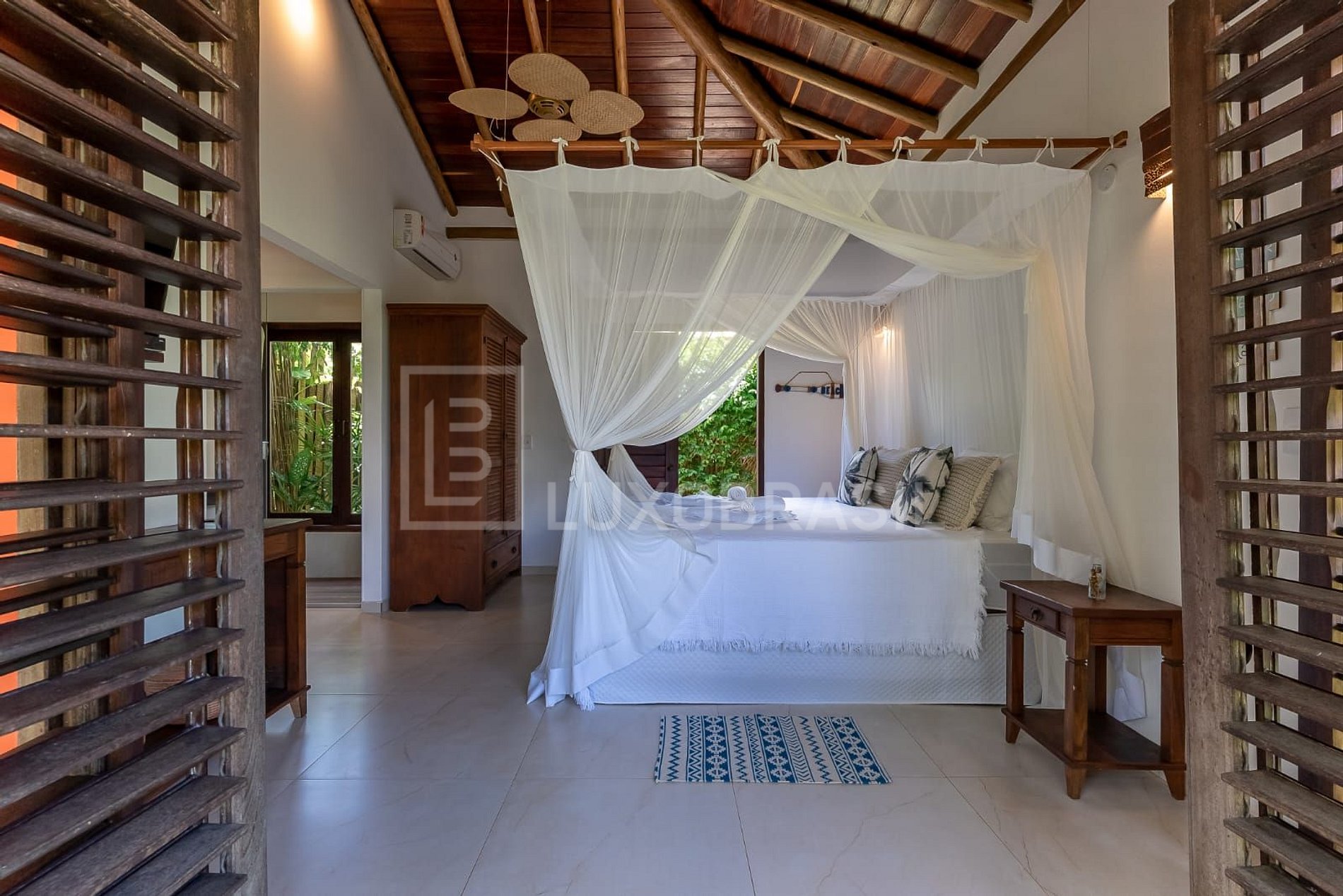 Hermosa casa en el Condominio Coqueiral, en una zona de preservación permanente, a 1,5 kilómetros del Quadrado y a 2 kilómetros de las hermosas playas. La casa tiene un concepto sostenible, una piscina biológica con plantas y peces, una bañera de hidromasaje integrada en el jardín y un sistema de calefacción solar.