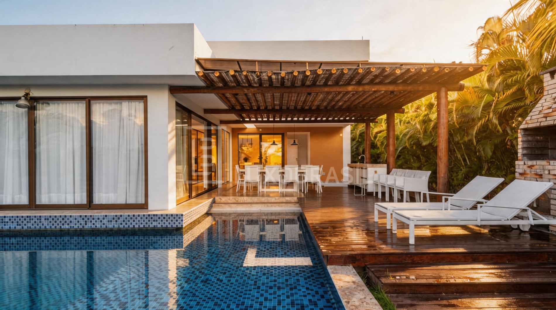 Ocio privado: Piscina con deck y área de convivencia integrada.