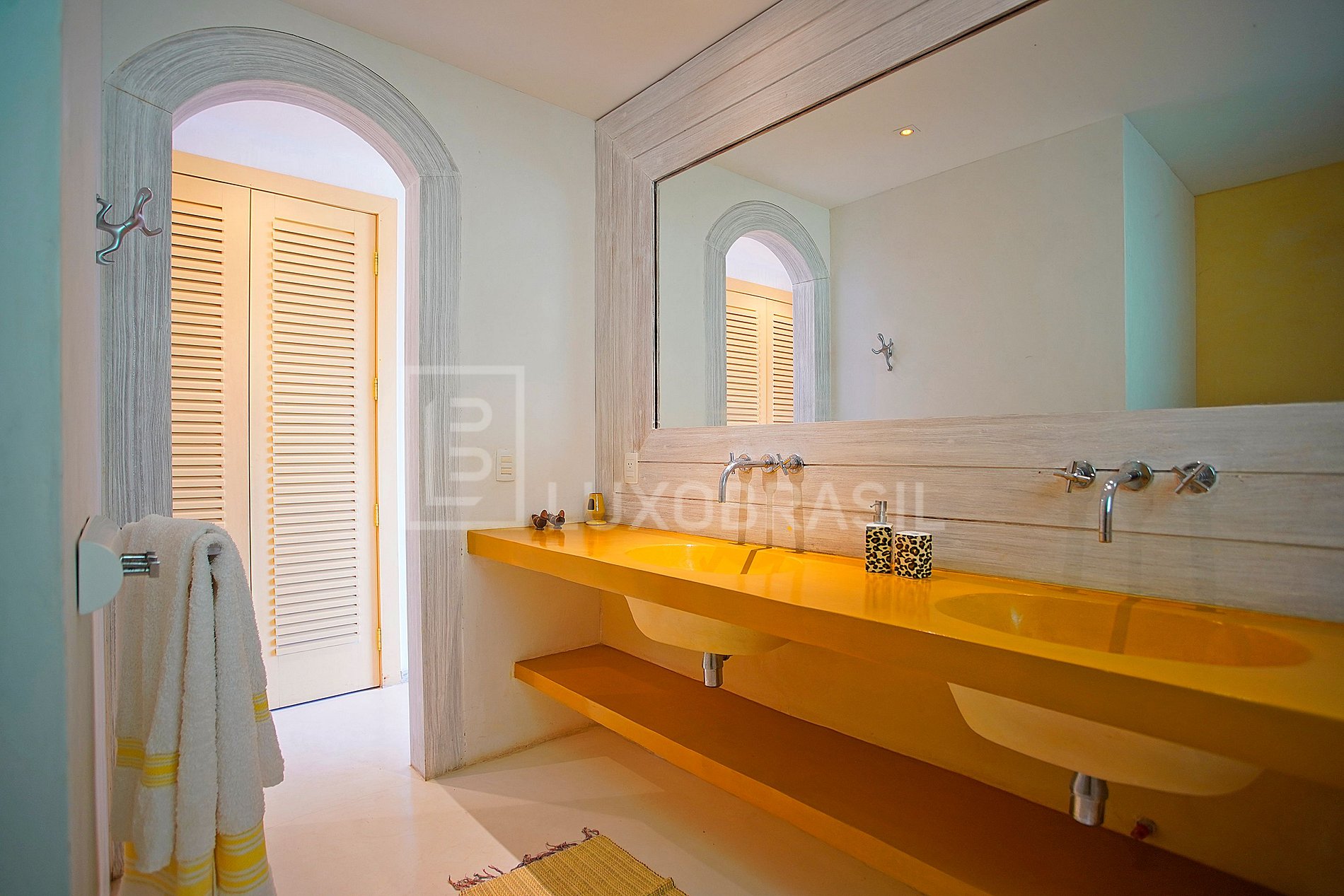Com 06 amplas e aconchegantes suítes, todas climatizadas, a mansão conta ainda com uma sala de estar interligada à sala de jogos, lavabo, cozinha e espaçosa sala de jantar. A área externa é um verdadeiro refúgio, com piscina de frente para o mar, sauna e área gourmet com churrasqueira.