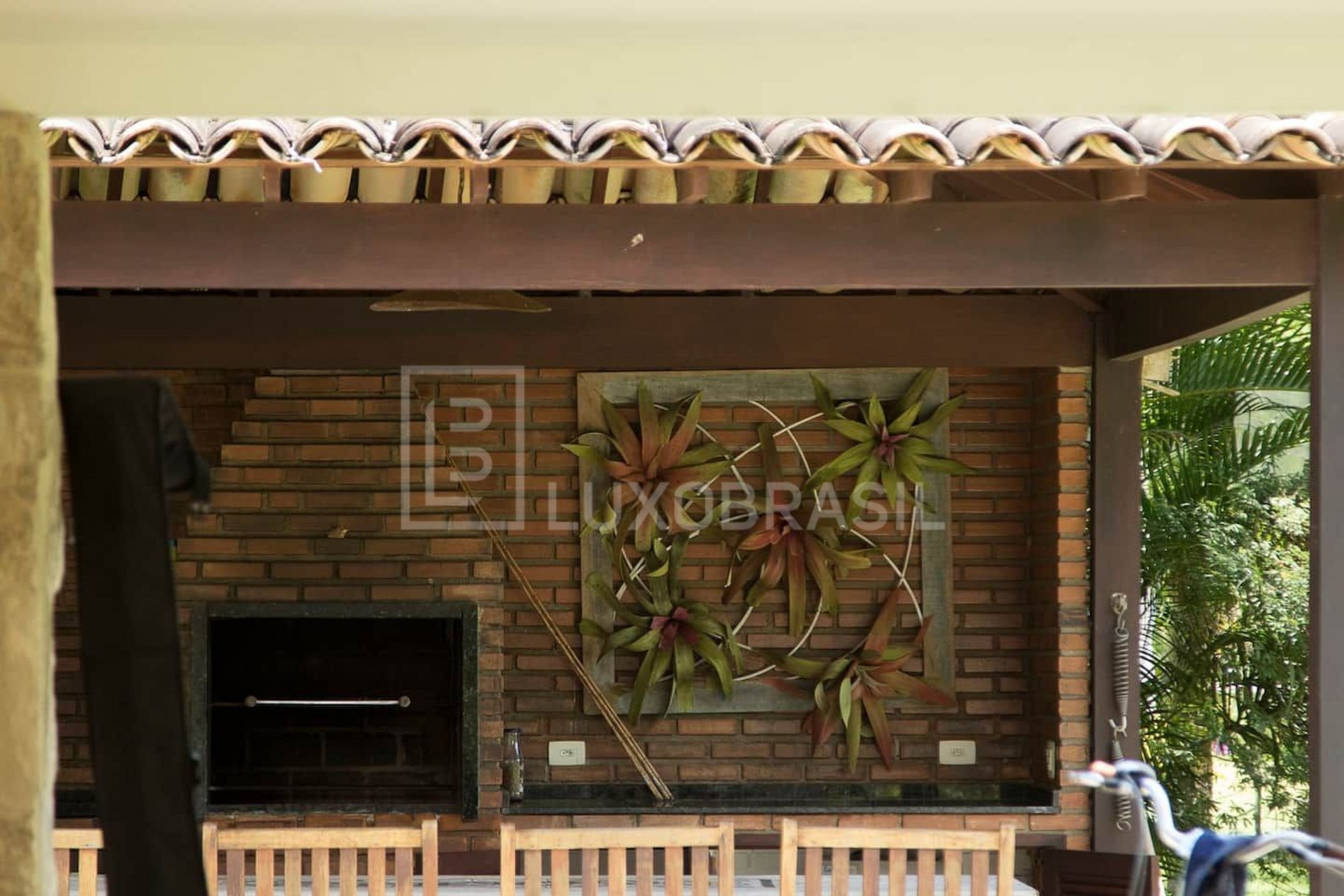 A área externa é um verdadeiro refúgio particular, onde um jardim se integra à paisagem natural, criando um ambiente de tranquilidade e beleza.