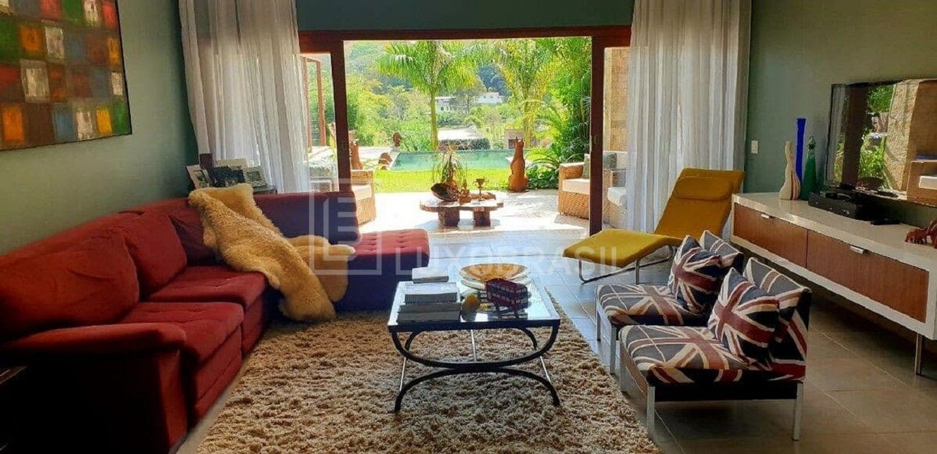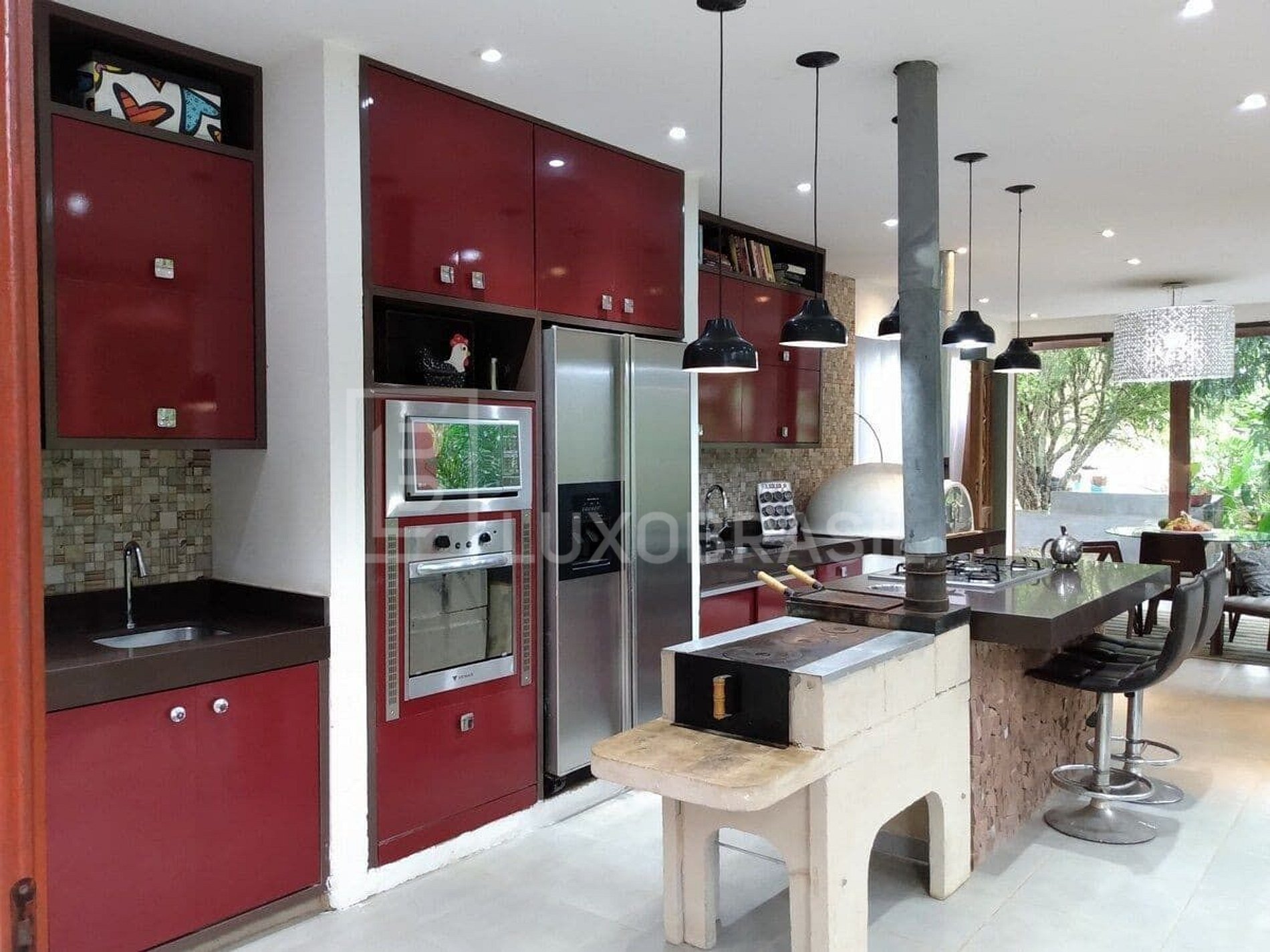 La casa es amplia y ventilada, gran sala de estar y sala de televisión, ambos con chimenea, cocina totalmente equipada y zona gourmet integrado con barbacoa y horno de leña, cortina de cristal que se integra con la naturaleza, lo único que se oye es el sonido del arroyo, y 05 confortables suites con camas queen-size, calefacción y aire acondicionado para los días calurosos.