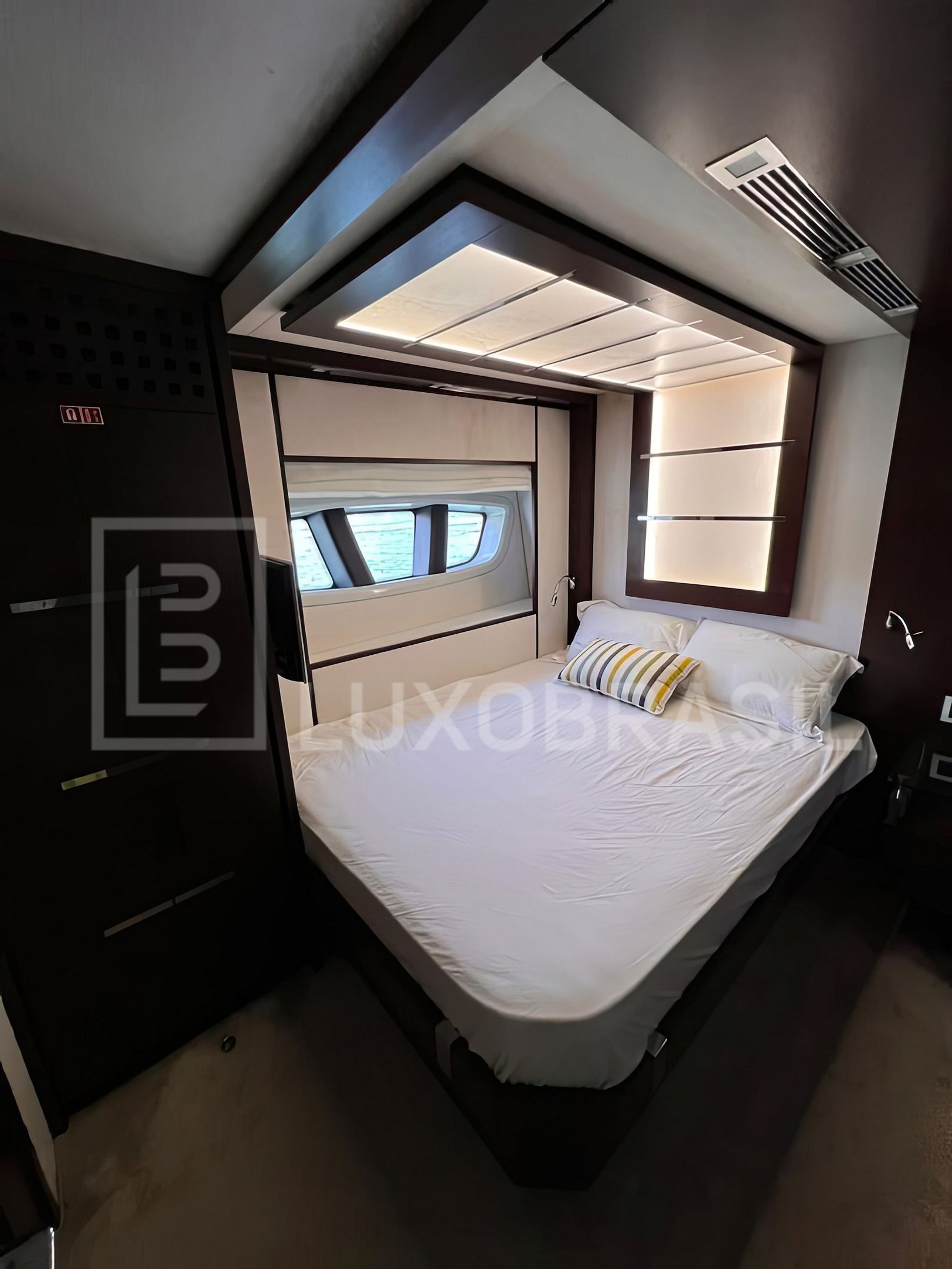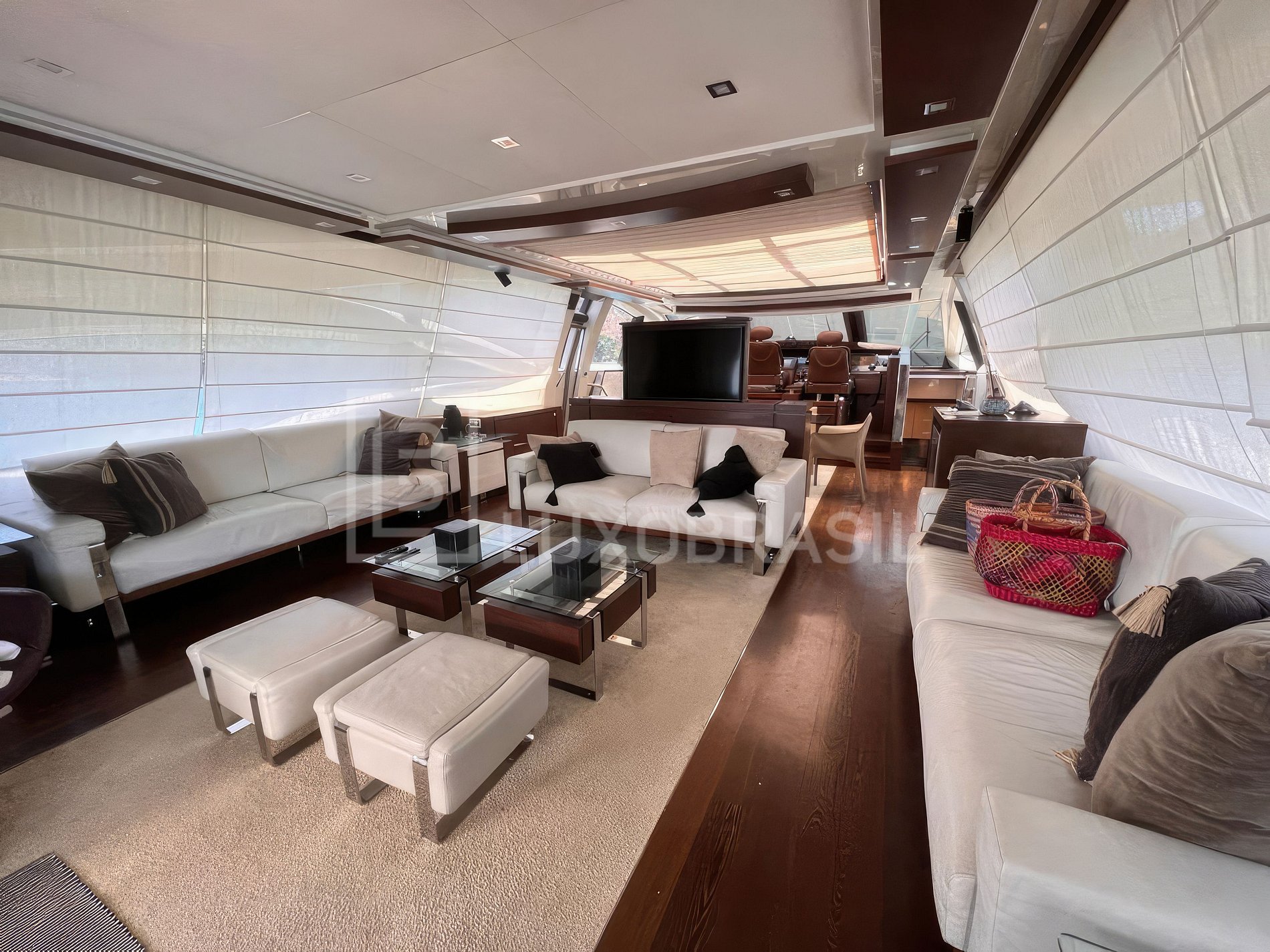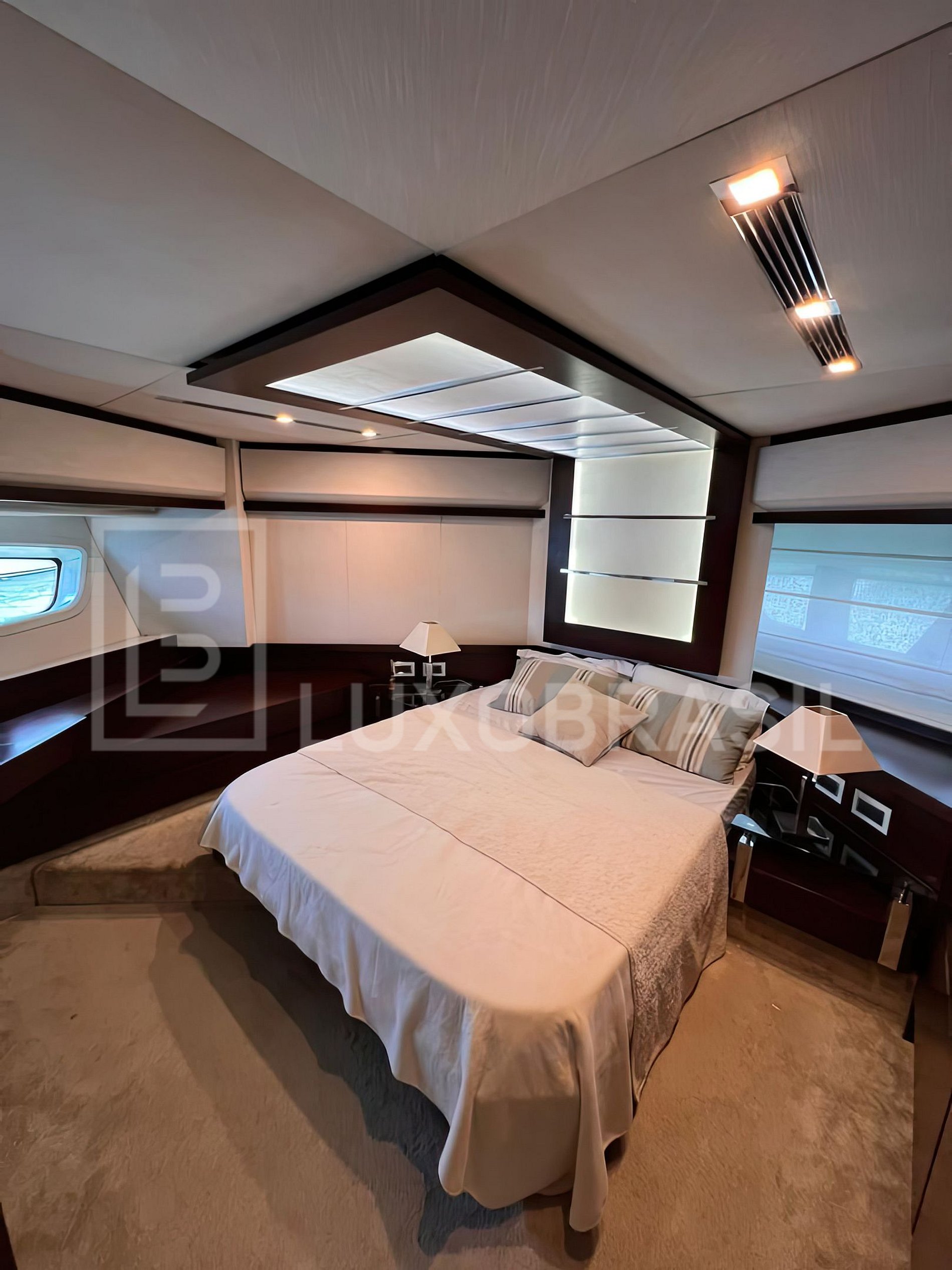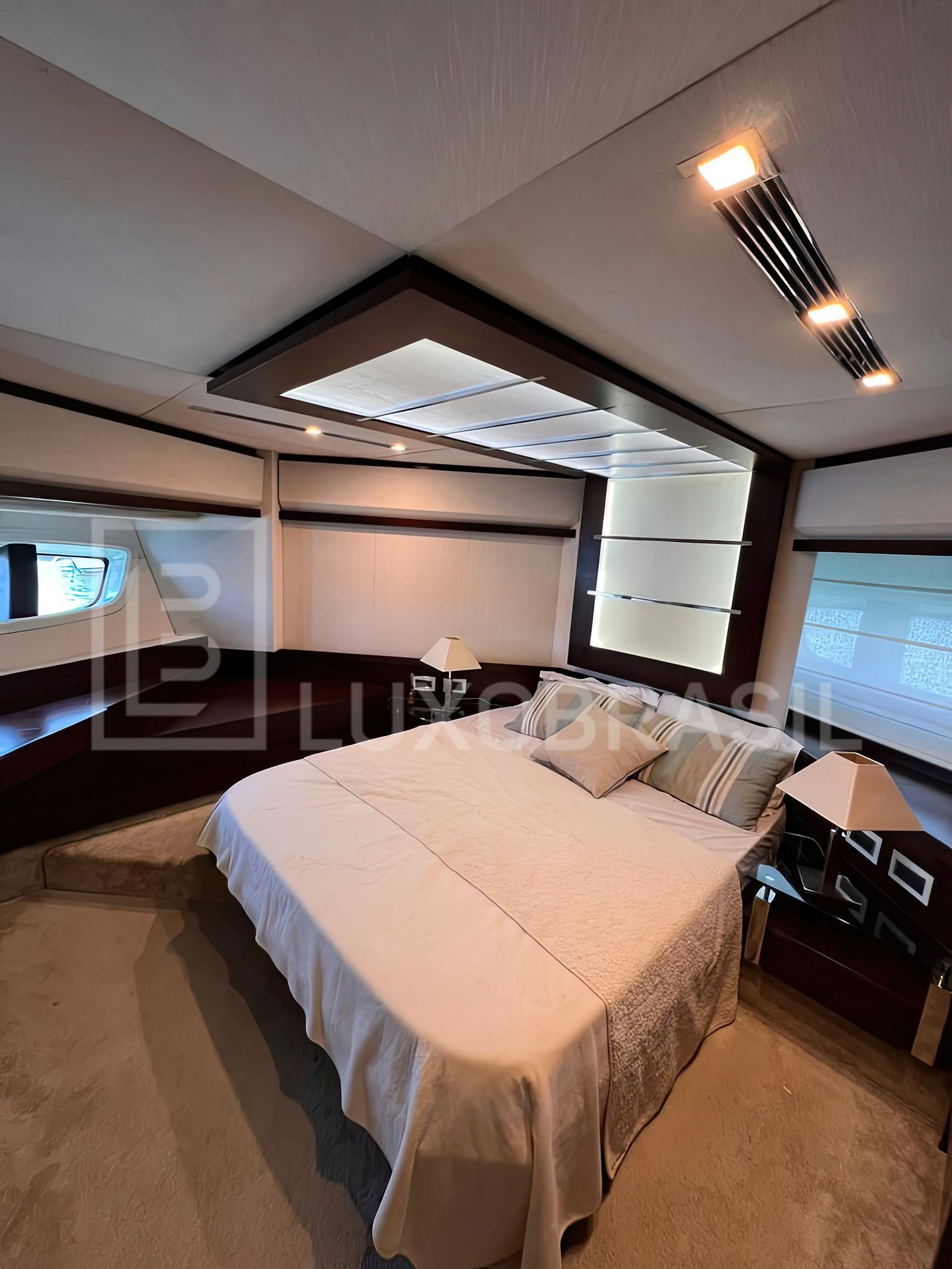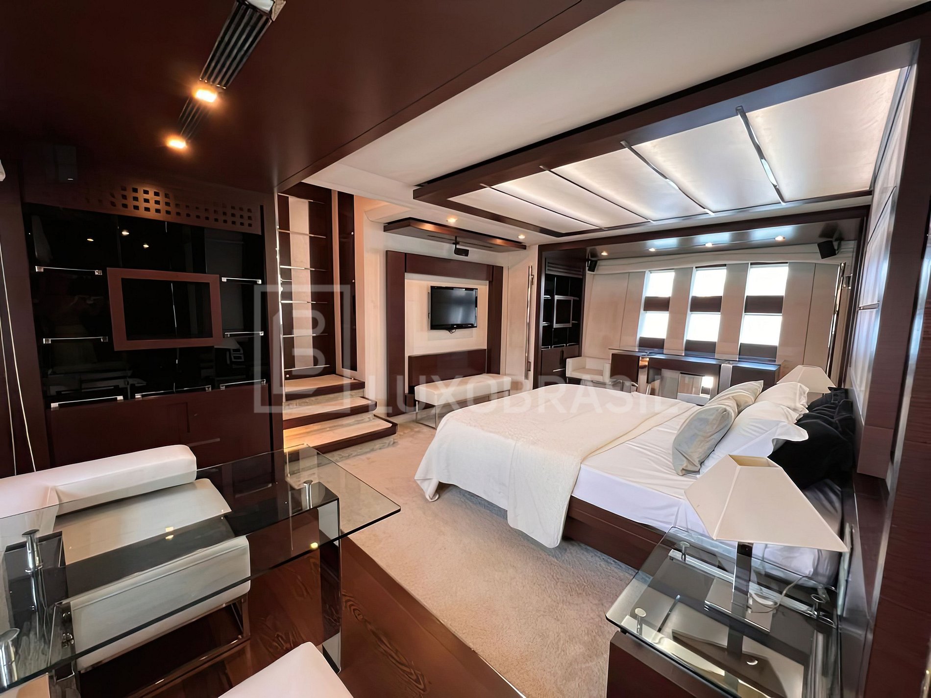 Iate conta com 04 suítes, sala de estar e jantar com acesso a área externa com espaço para aproveitar o sol, bar e mesa para fazer refeições.