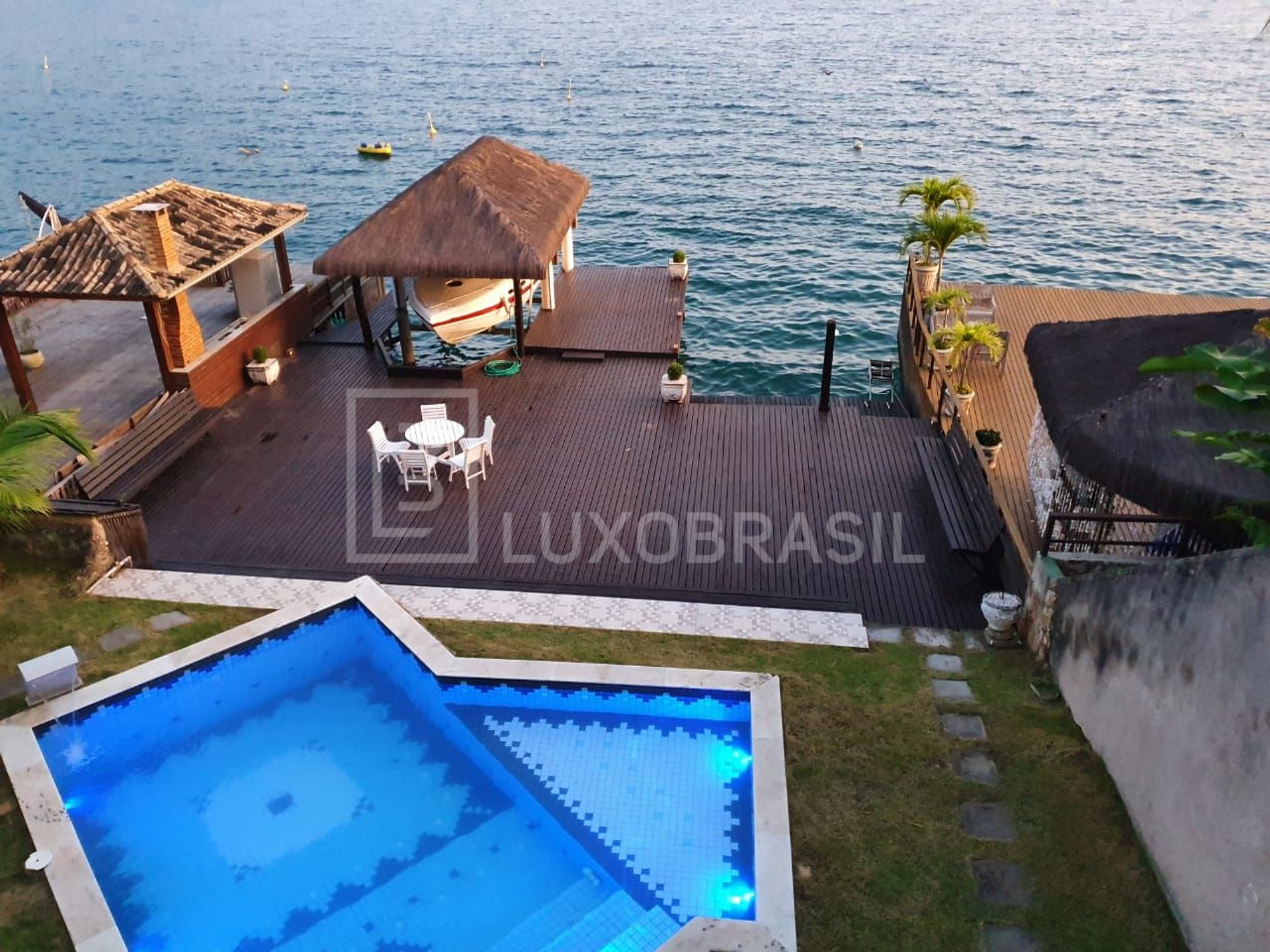 Su área exterior tiene una hermosa vista, acceso al mar, poitas y muelle para amarre de embarcaciones. Também possui piscina, deck, sauna e um espaço gourmet com barbacoa.