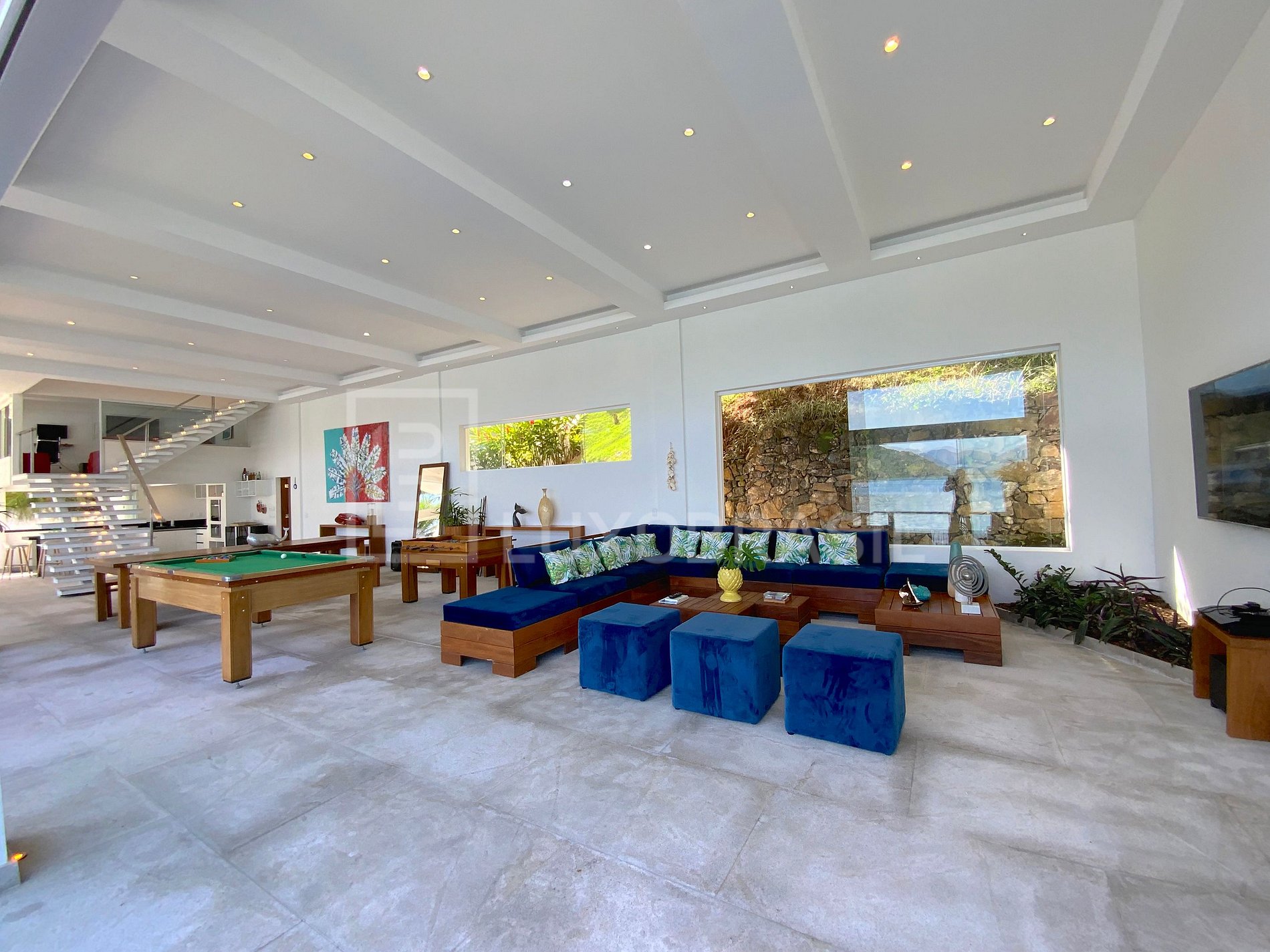 La sala de estar tiene un cine en casa y mesa de comedor, grandes ventanales, lo que permite mucha luz natural. También tiene una mesa de billar y mesa de ping-pong, aseo y cocina gourmet integrada. Cocina totalmente equipada con electrodomésticos modernos y máquina de hielo. Maravillosa zona al aire libre con piscina, jacuzzi compartido la parte interna de la sauna, barbacoa, gas y carbón, playa privada, cubierta y muelle.