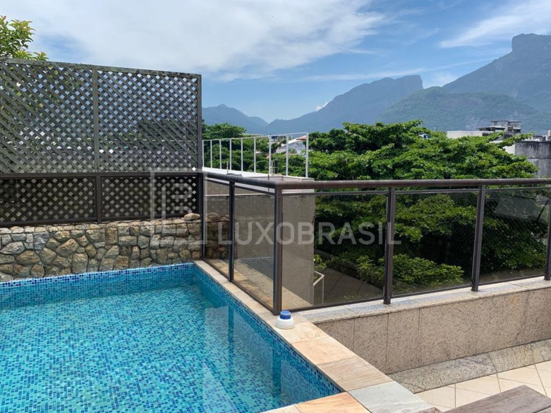 Varandão com piscina privativa e vista deslumbrante da imponente Pedra da Gávea.