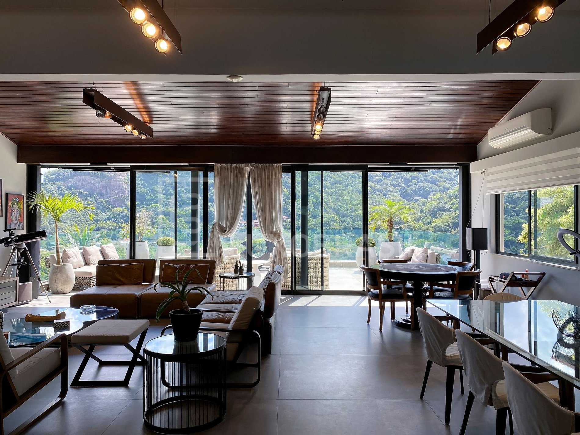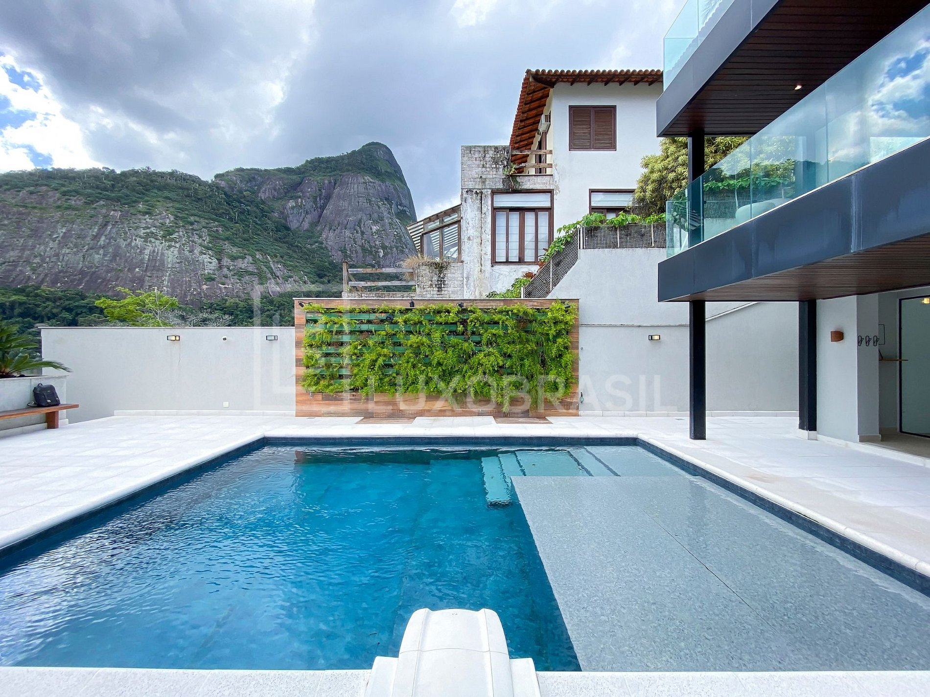 Con 852 m² de área construida sobre un terreno inclinado de 1.000 m², la propiedad se destaca por su arquitectura audaz, vistas impresionantes a la Pedra da Gávea y una integración perfecta entre los espacios. La casa cuenta con sistema de automatización de luz y sonido, cámaras de seguridad, paneles solares para generación de energía y un ascensor panorámico exterior, además de un proyecto de iluminación y sonido de primer nivel.
