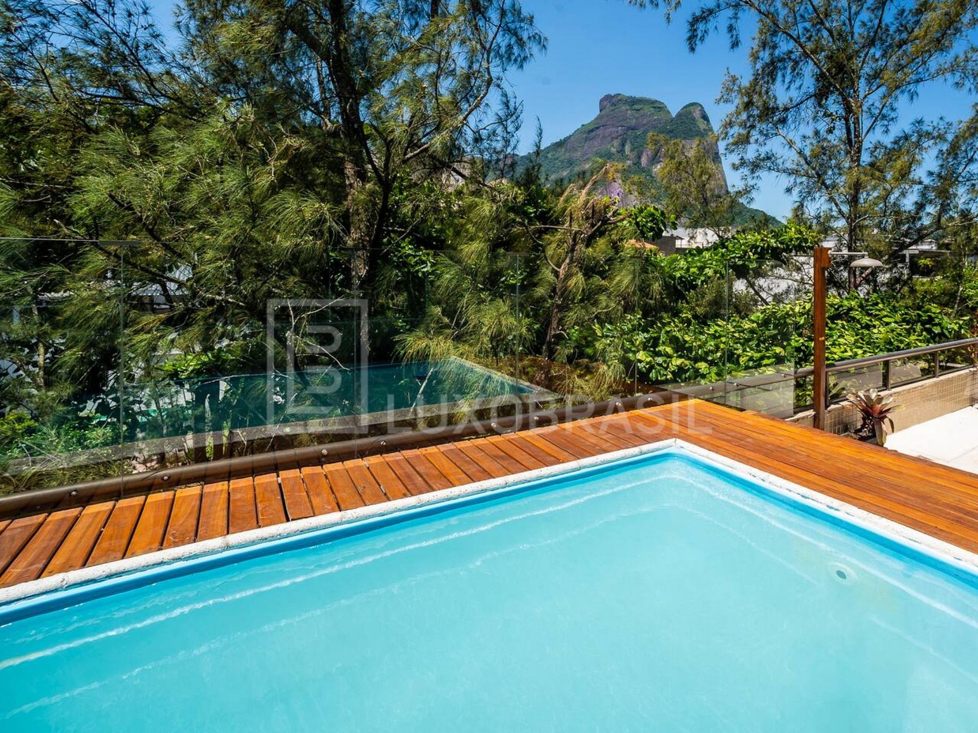 En el segundo nivel, destaca el balcón con vista al mar y al Pedra da Gávea, zona de parrilla, deck de madera y piscina privada — un verdadero oasis urbano. Todas las habitaciones tienen acceso al balcón y vista a una calle arbolada y tranquila, garantizando privacidad y ventilación natural.